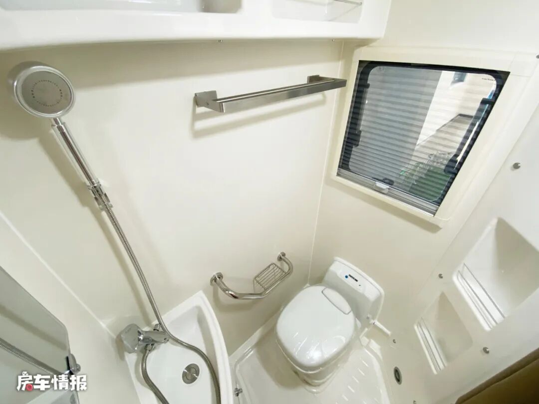 最后是位于车尾一角的独立卫浴室,内部提供了马桶、独立的淋浴花洒、洗手台盆和置物架等,能够解决平时的洗漱需求。
