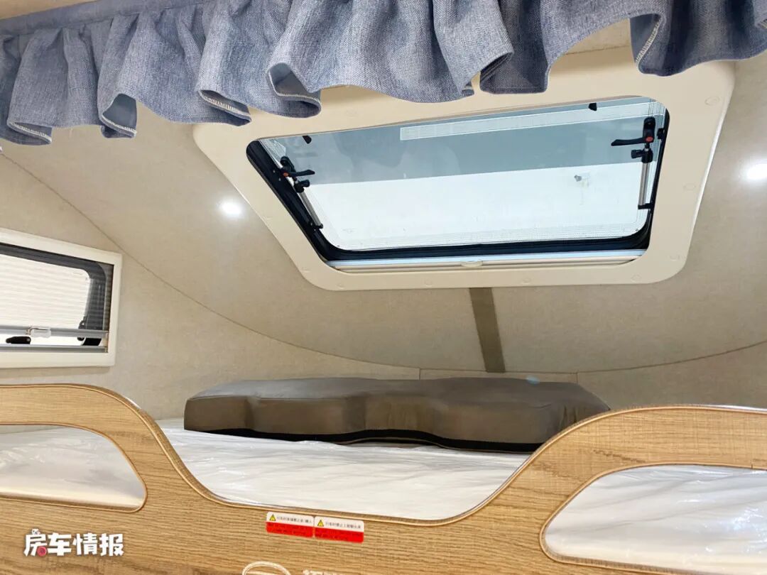 在最前方驾驶室顶部的额头区域内,提供了一张标准的额头床,尺寸为2200*1400mm,可以满足日常的睡眠休息需求,而这也是整辆车中唯一一张固定式的床铺。
