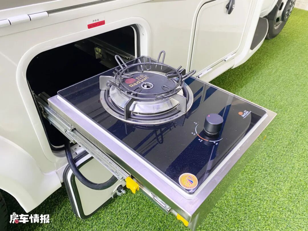车身外部配置了基础的手动遮阳棚,下方则是一个户外的烹饪区,带有外置抽拉灶台、外置淋雨花洒,天气好的时候也可以在车外进行烹饪。