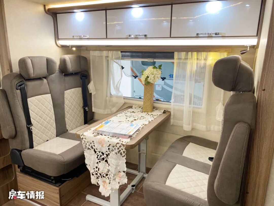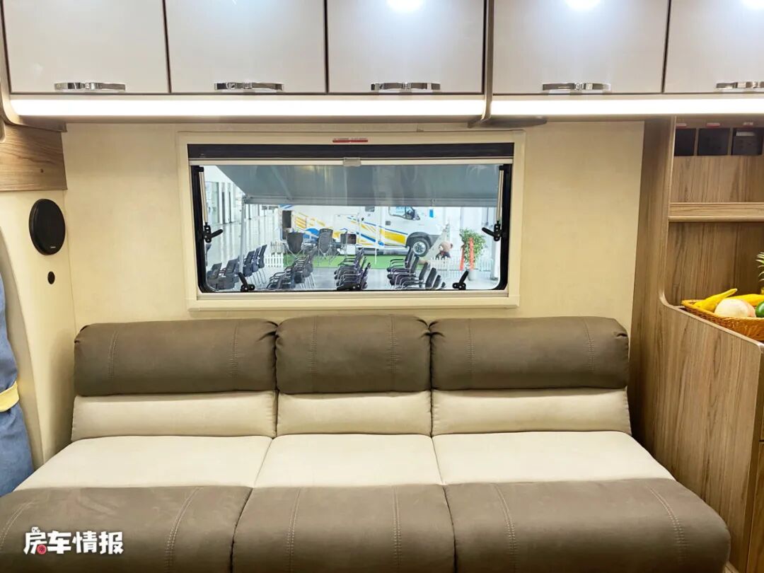位于侧拓展舱内的是全车的会客区,采用经典的四人对卡座沙发布局,取消了常见固定式的升降餐桌,取而代之的是一张可移动的餐桌,所以当室外天气好的时候,也可以移至到车外使用,上方则配置了基础的吊柜,可以存放一些日常物品。如果有临时的睡眠需求,晚上也可以变成一张尺寸为1500*1000mm的沙发床。