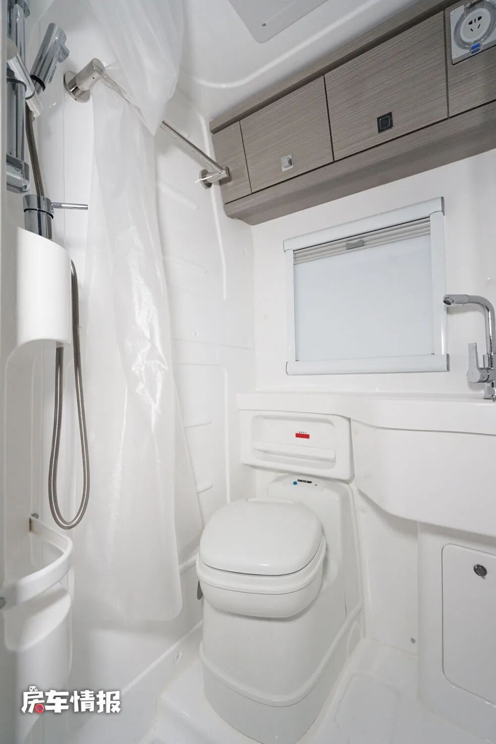 与之相对的是全车的卫浴室,内部的空间表现也不错,并且配置了齐全的洗漱设施,包括马桶、淋浴花洒、洗手台盆、储物吊柜等,能够满足日常的洗漱需求。