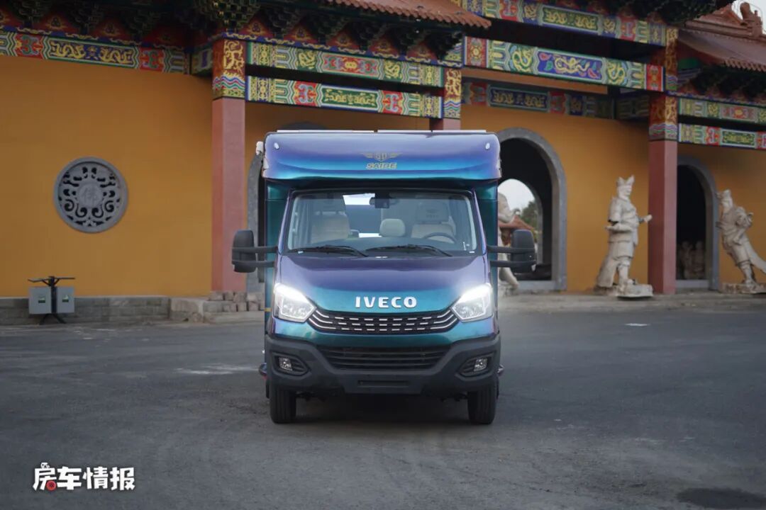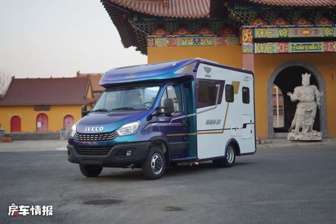 这款房车就是来自于赛德房车旗下的一款代表性车型——猎鹰02号G系列,顾名思义,G系列则是代表整辆车基于国产的依维柯欧胜底盘所打造,在造型上,全车是采用了流线型小顶的设计,加上特有的大面积炫彩配色,使整辆车在众多单一色的房车中脱颖而出,十分出挑,而且外观上还颇有猎鹰的形似感。