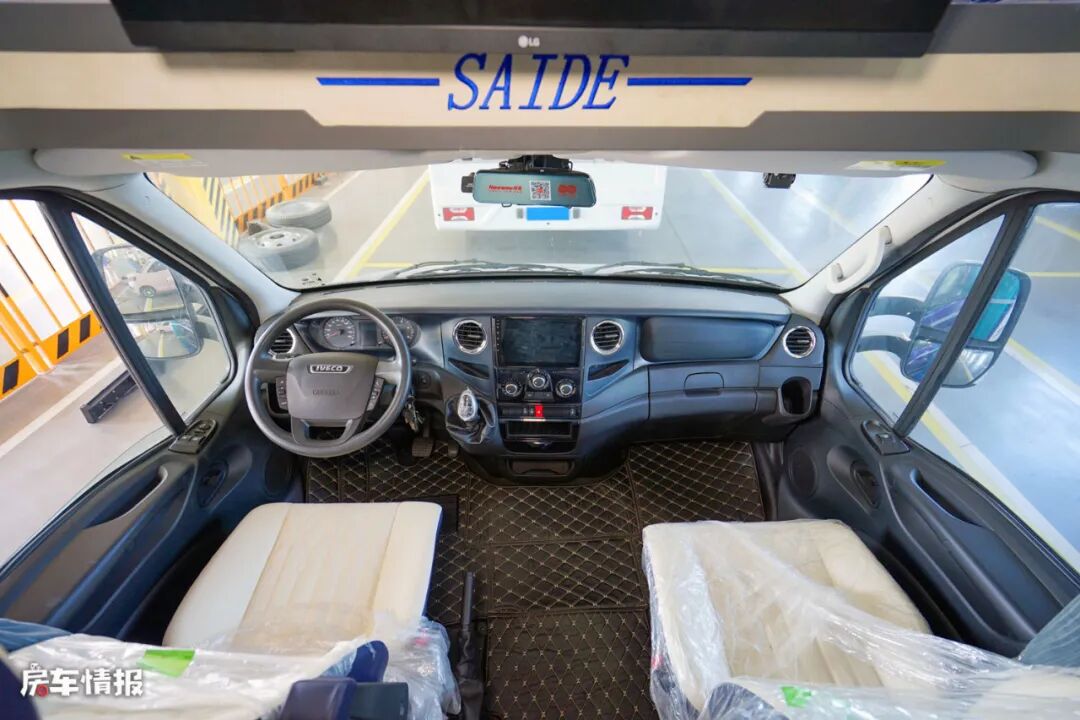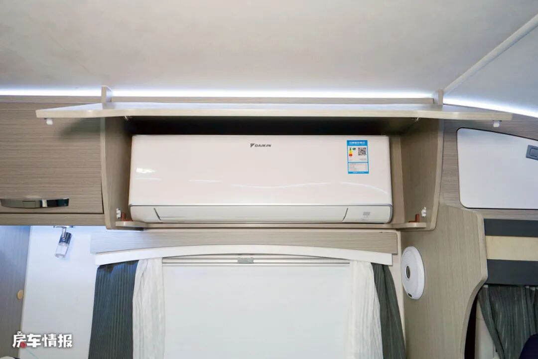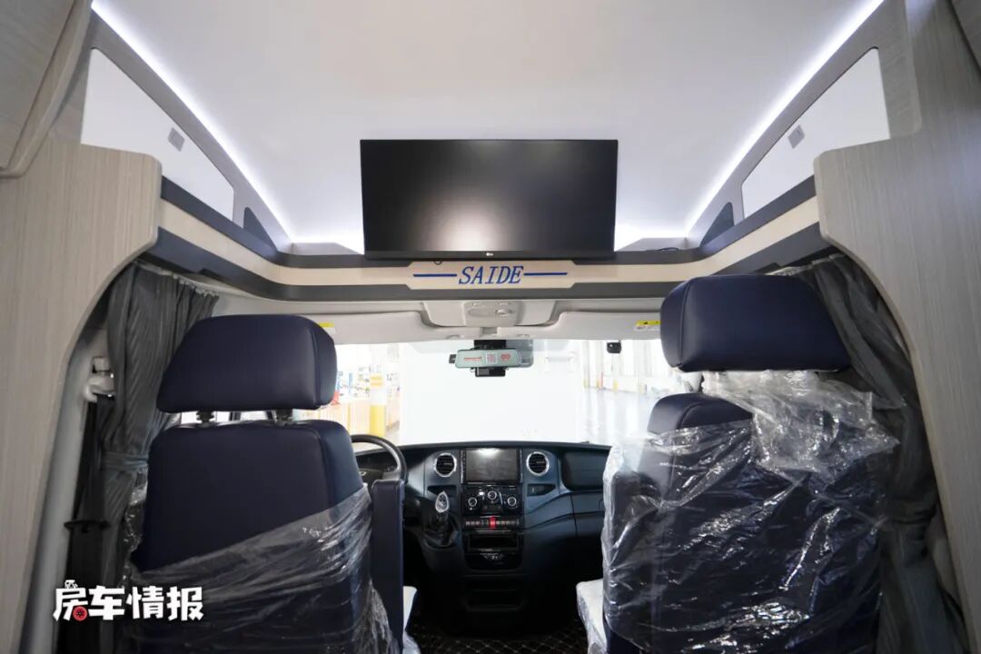 最前方驾驶室上方取消了大额头中常见的额头区域,取而代之的是一台32寸的液晶电视,可以为日常的旅行生活平添娱乐项目。