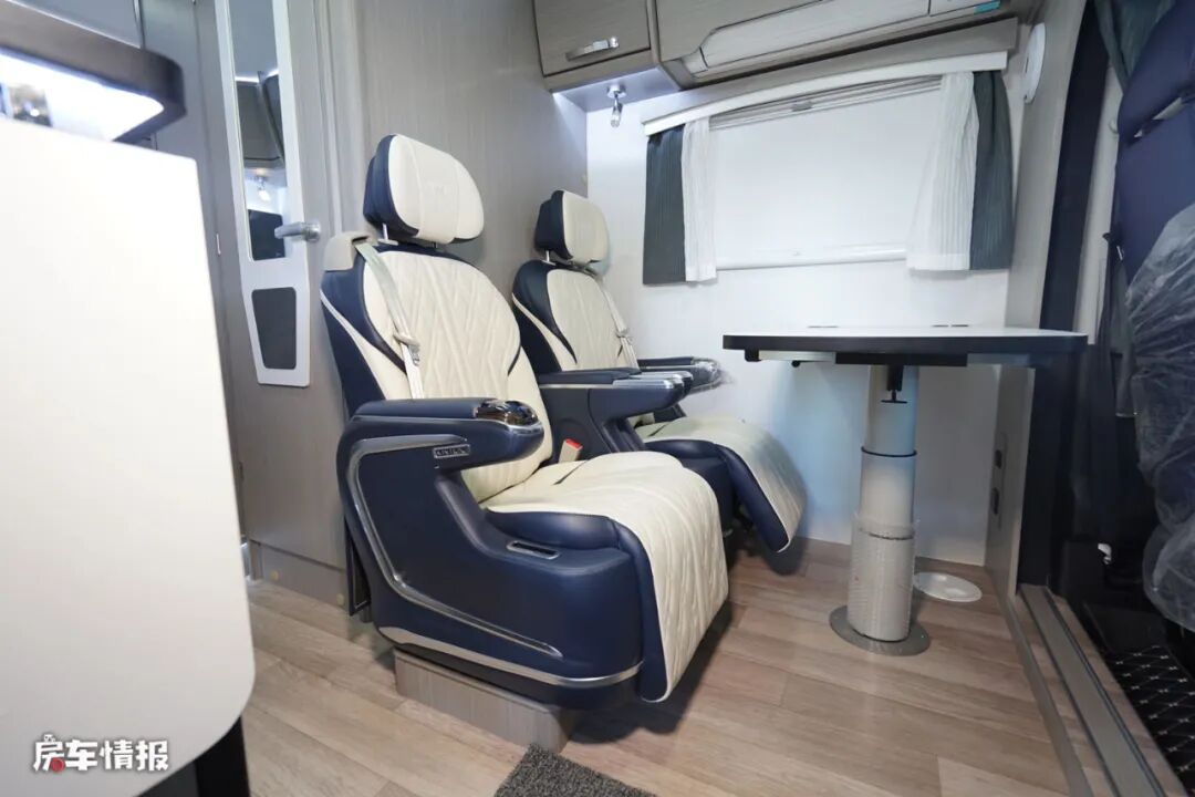 会客区采用了双人沙发+升降餐桌的设计,不过双人沙发全部使用的是航空座椅,不仅带有脚托、加热、通风和按摩功能,还能够通过扶手处的显示屏进行操作,将科技与舒适融合在了一起。另外顶部则隐藏了一台家用变频空调,可以按需调节车内的温度,从而达到一个舒适的居住环境。