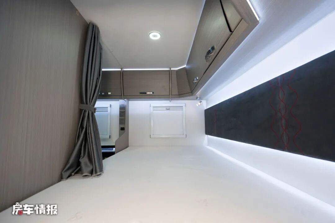 作为一款适合两人用的房车,这款车内的休息区是采用了横置尾床的设计,不仅私密性好,而且整体的尺寸也能够容纳两个成年人使用,另外在顶部还配置了大量的储物吊柜,满足日常储物的需求。