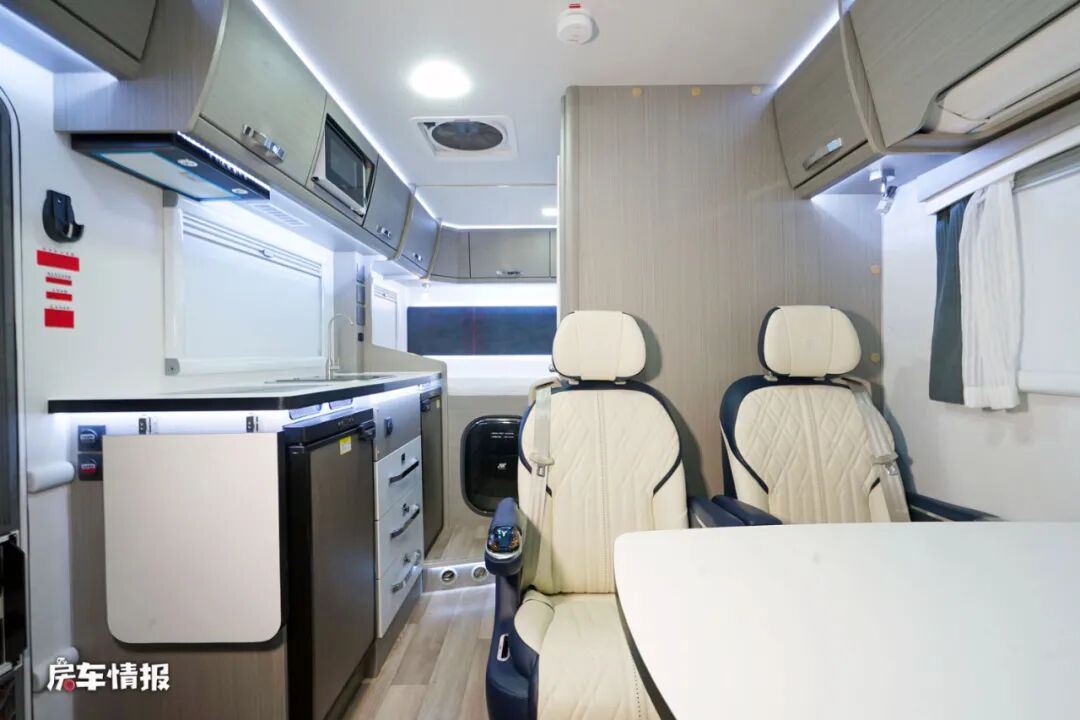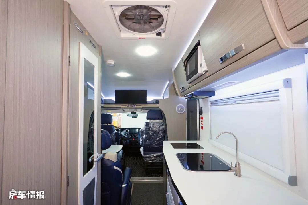 乘客门后方则是超大尺寸的厨房操作台,侧面还提供了拓展的桌板,对于烹饪爱好者来说绝对是福音,台面上提供了大功率的电磁炉、翻盖的不锈钢洗菜池,顶部还配有单独的抽油烟机和微波炉,下方则带有储物空间,两侧分别嵌入了76L的冰箱,可以满足日常分类存放食材的需求。