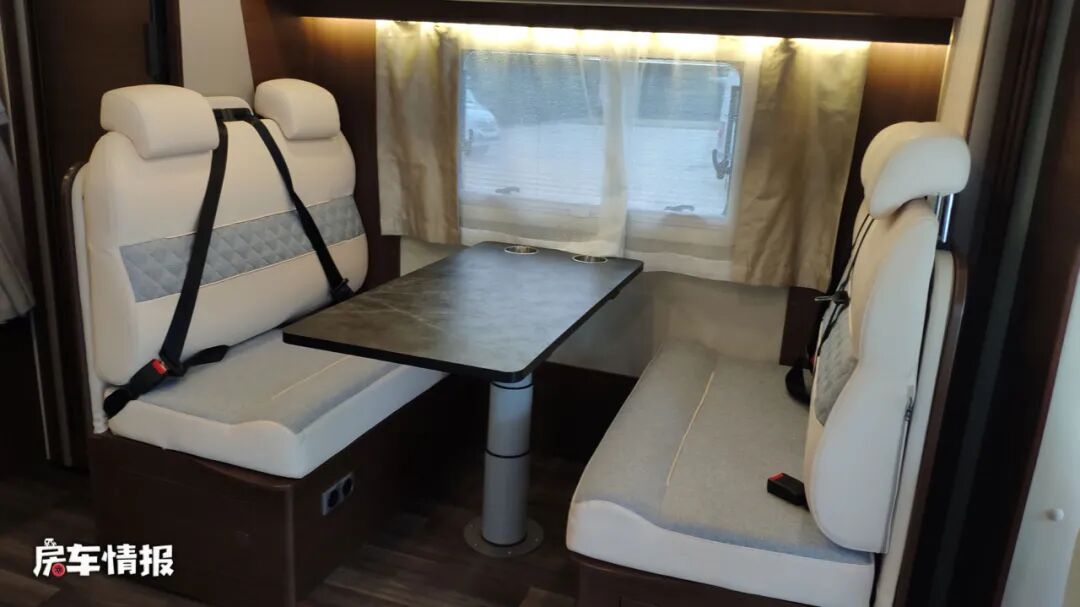 在拓展区域内的是全车的会客区,由两排对坐沙发和一张可升降的餐桌组成,沙发座椅配有四条安全带,所以整车行车时最多可以核载6人。