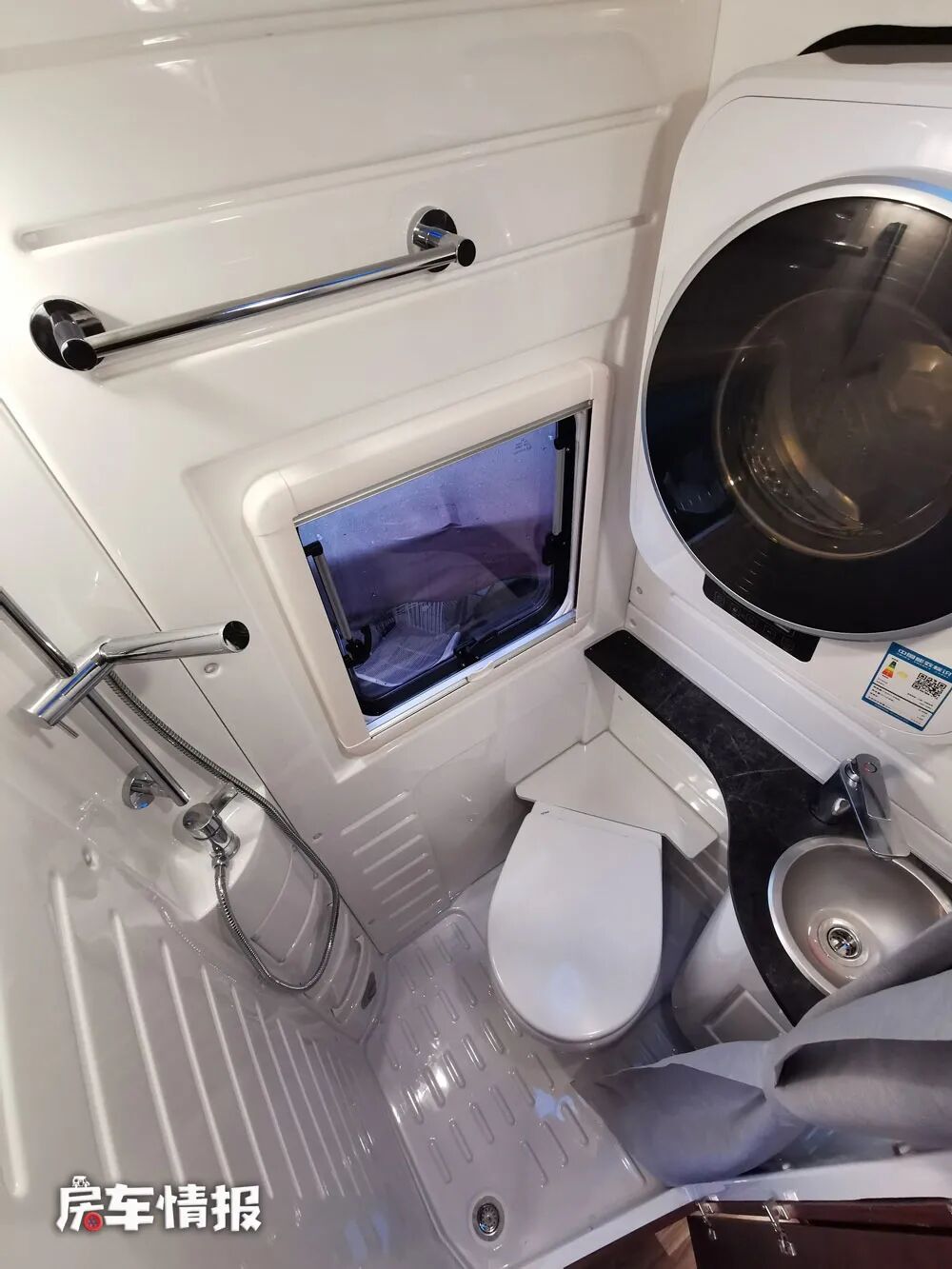厨房区后方是一间单独的卫浴室,面积不是很理想,但还是提供了包括马桶、淋浴花洒、洗漱台和毛巾架在内的洗漱设施,满足出行洗漱的需求,另外在马桶的上方还悬挂了一台迷你洗衣机,平时可以洗一些小型的衣物。