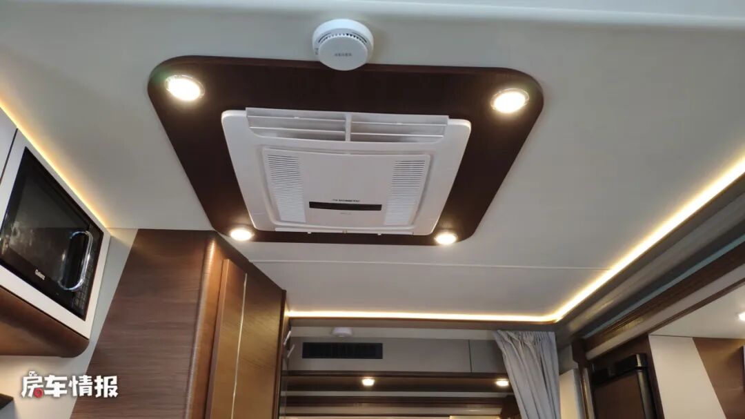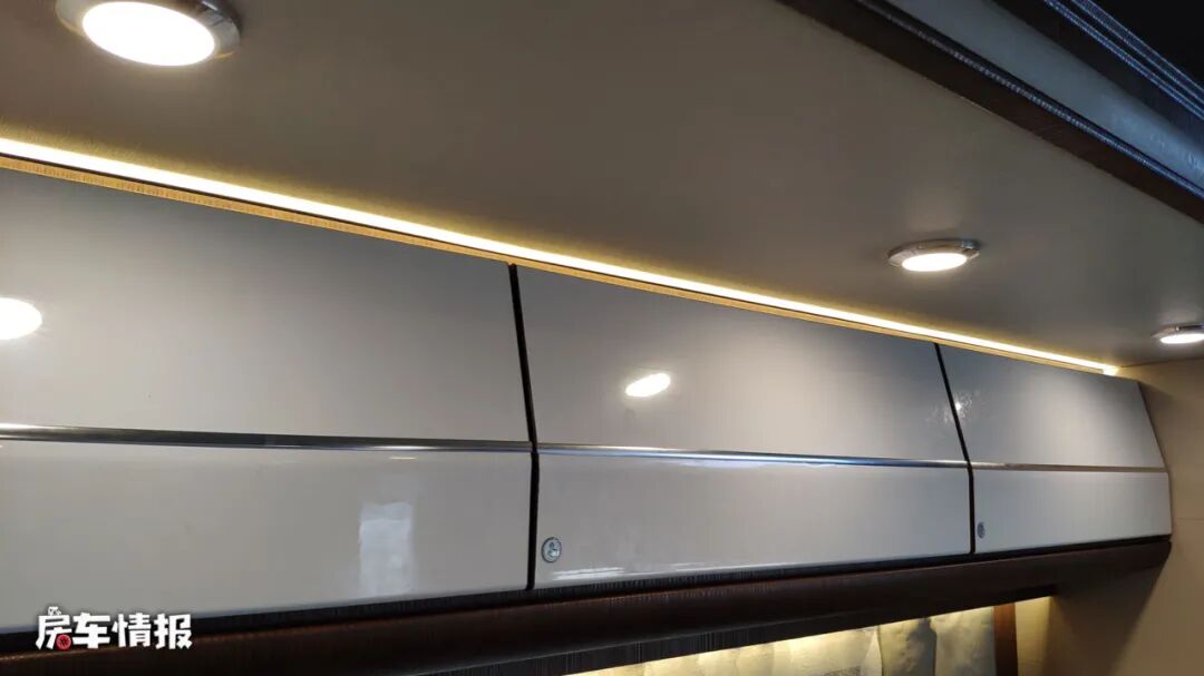 乘客区上方提供了一排储物吊柜,储物空间还是非常充足的。顶部则配备了一台顶置空调,控制全车的冷暖。另外在驾驶室下方还配备了一台32寸的互联网液晶电视,匹配智能影音系统,平时坐在会客区里看看电视追追剧,感觉也非常的惬意。