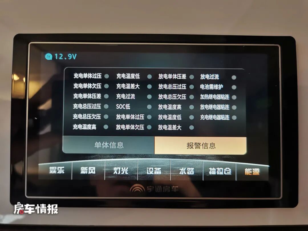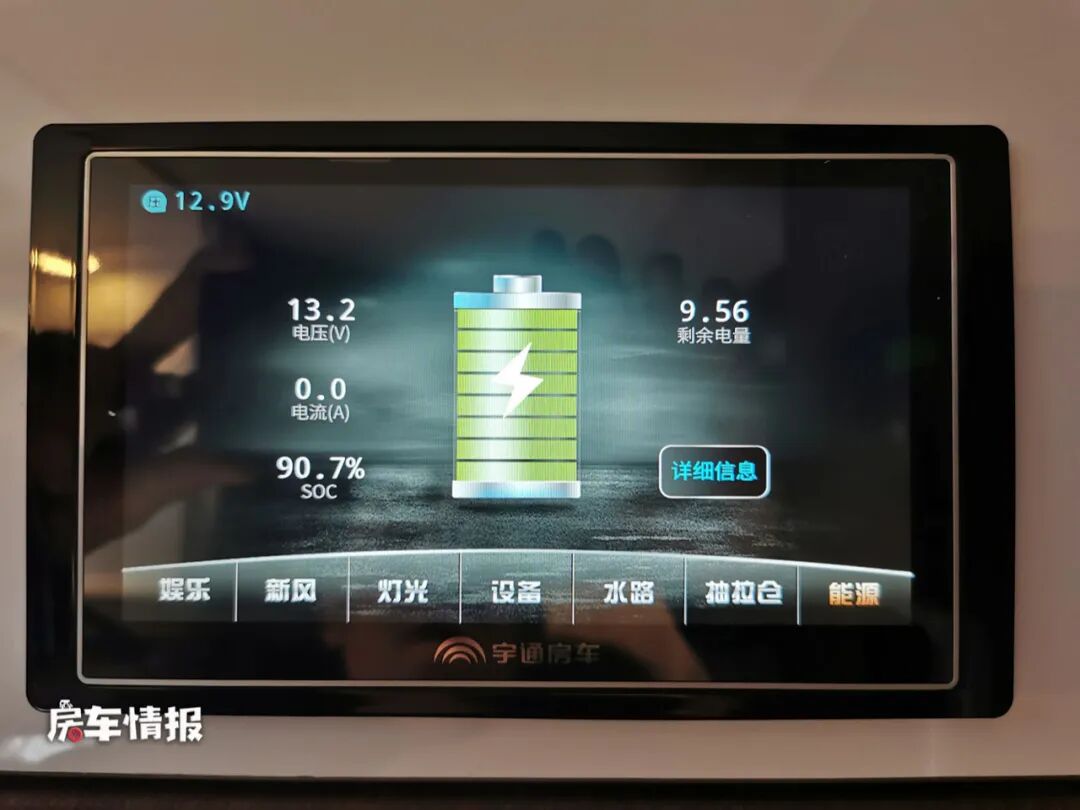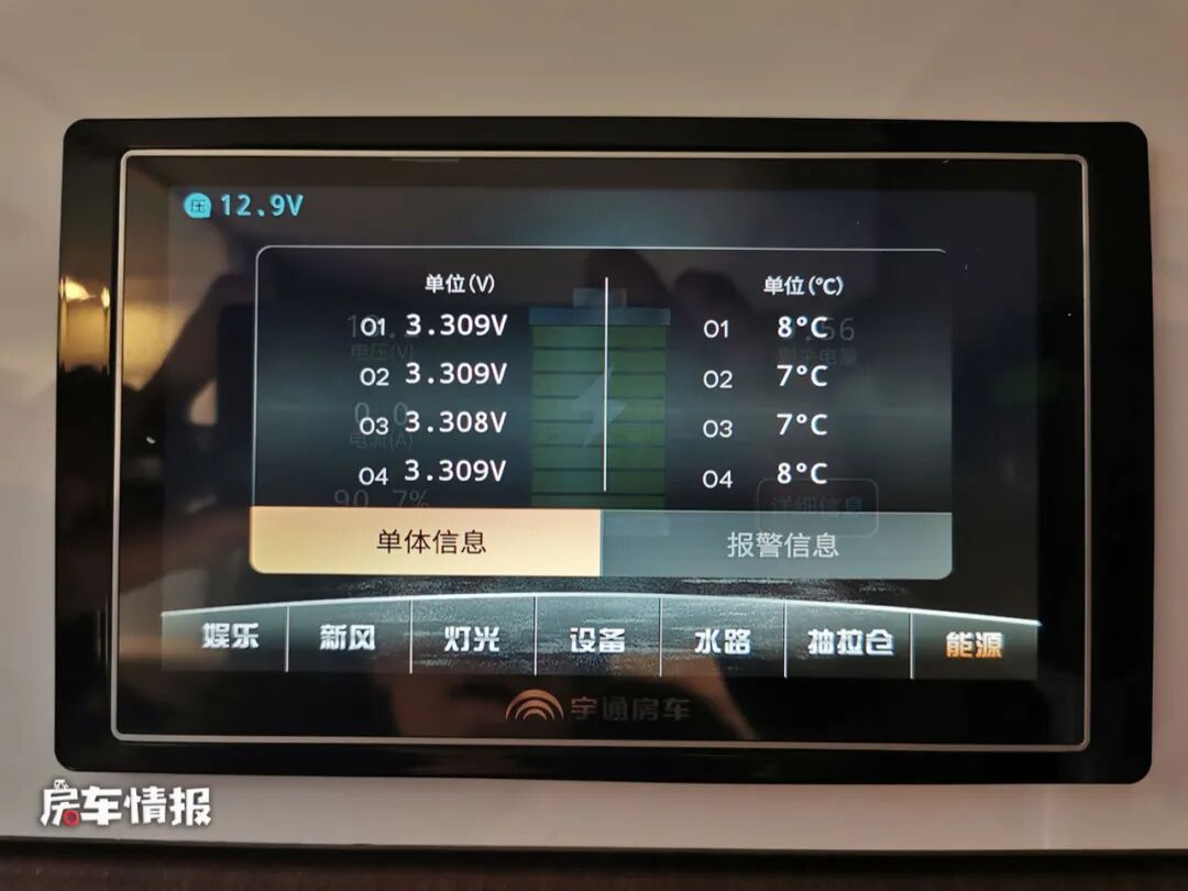 最后看一下全车的水电~电路上这款房车搭载了一台3000W的逆变器,提供800Ah的房车专用锂电池,顶配还配备了670W的太阳能电池板,水路上则提供了120L的净水箱、90L的副净水箱和60L的灰水箱,水电容量完全能够满足一家的需求。