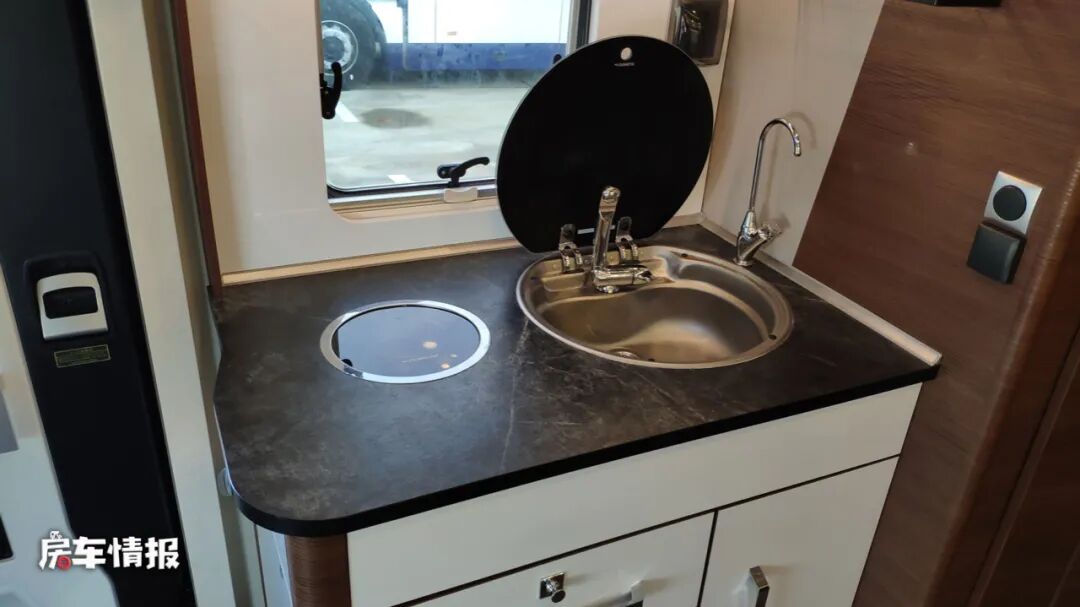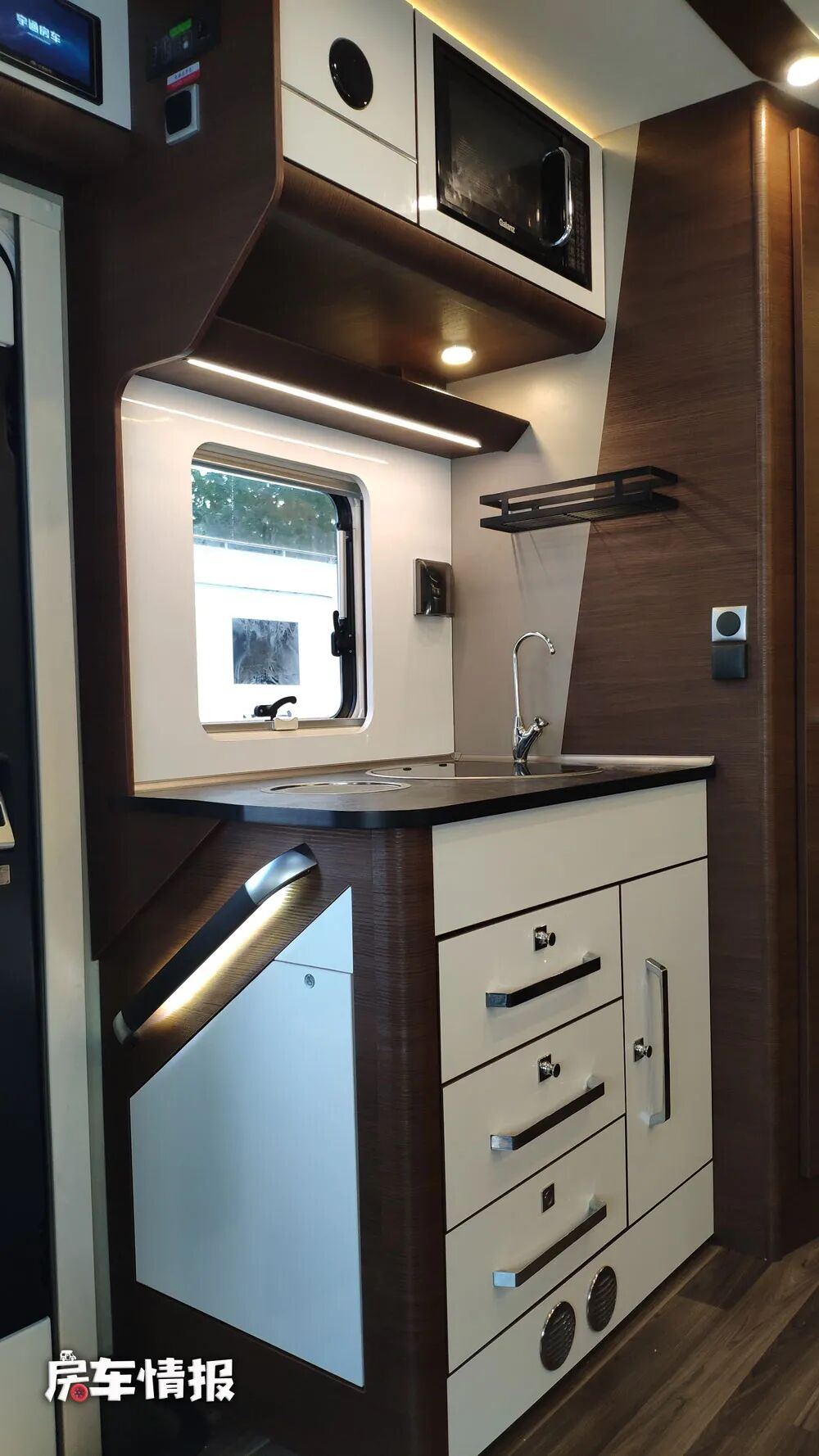 临近乘客门处是厨房操作台,相比之下尺寸还是比较常规的,提供了一台900W的电磁炉和一个不锈钢水盆,上方嵌入了一台微波炉。