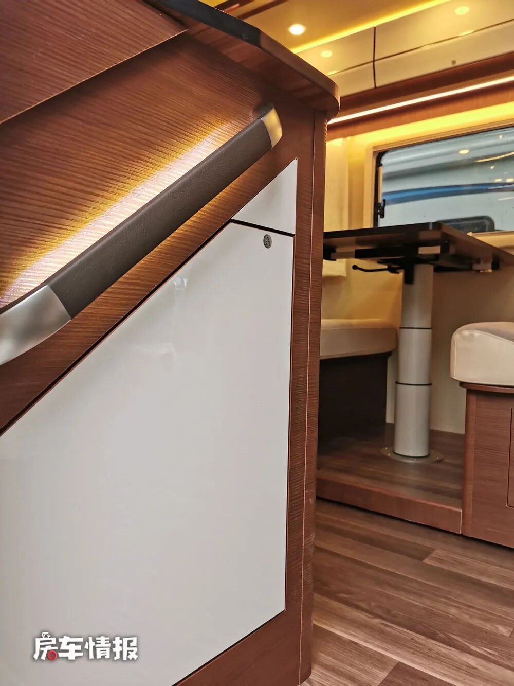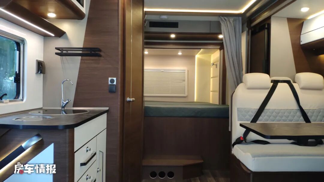 从车身右侧进入车厢,内部采用了深色系的装饰风格,虽然视觉感上没有那么通透,但是因为带有拓展区域,这款房车的左拓展区域可达1.4平米,后拓展区域也有1.2平米,所以整体的空间感还是非常宽裕的。