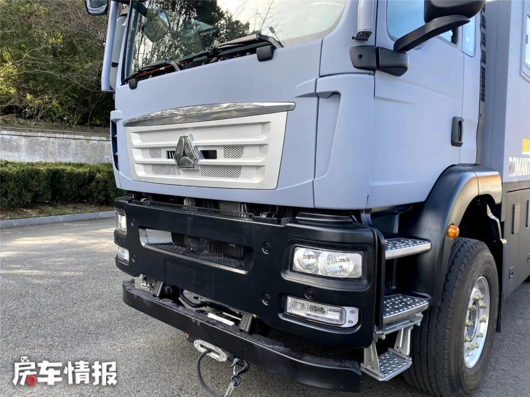 在正式开车之前,先来体验一下这款新车内外有何不同吧!和大多数基于重汽汕德卡打造的重卡房车一样,这款新车的颜值依然在线,水泥灰的涂装把它路上跑的重卡拖车头区分开来,显得比较有调性。