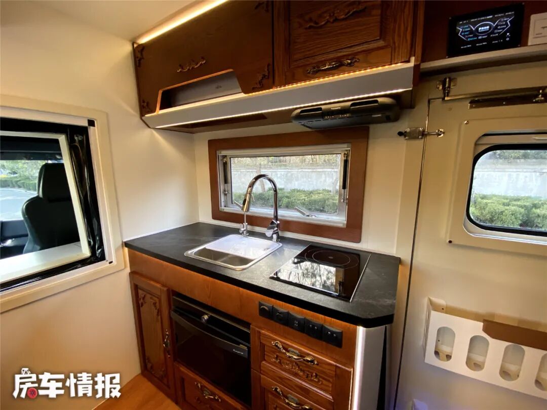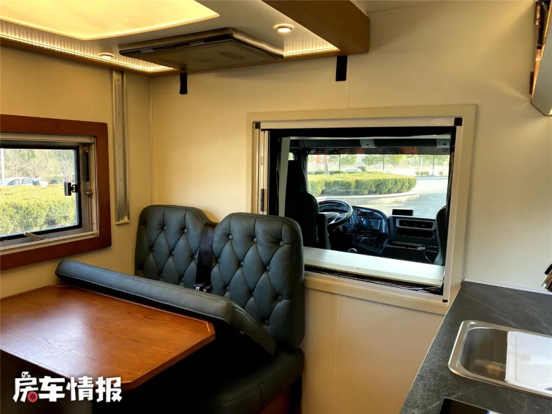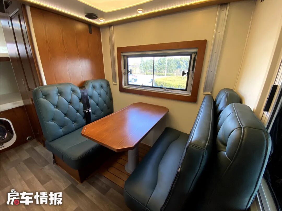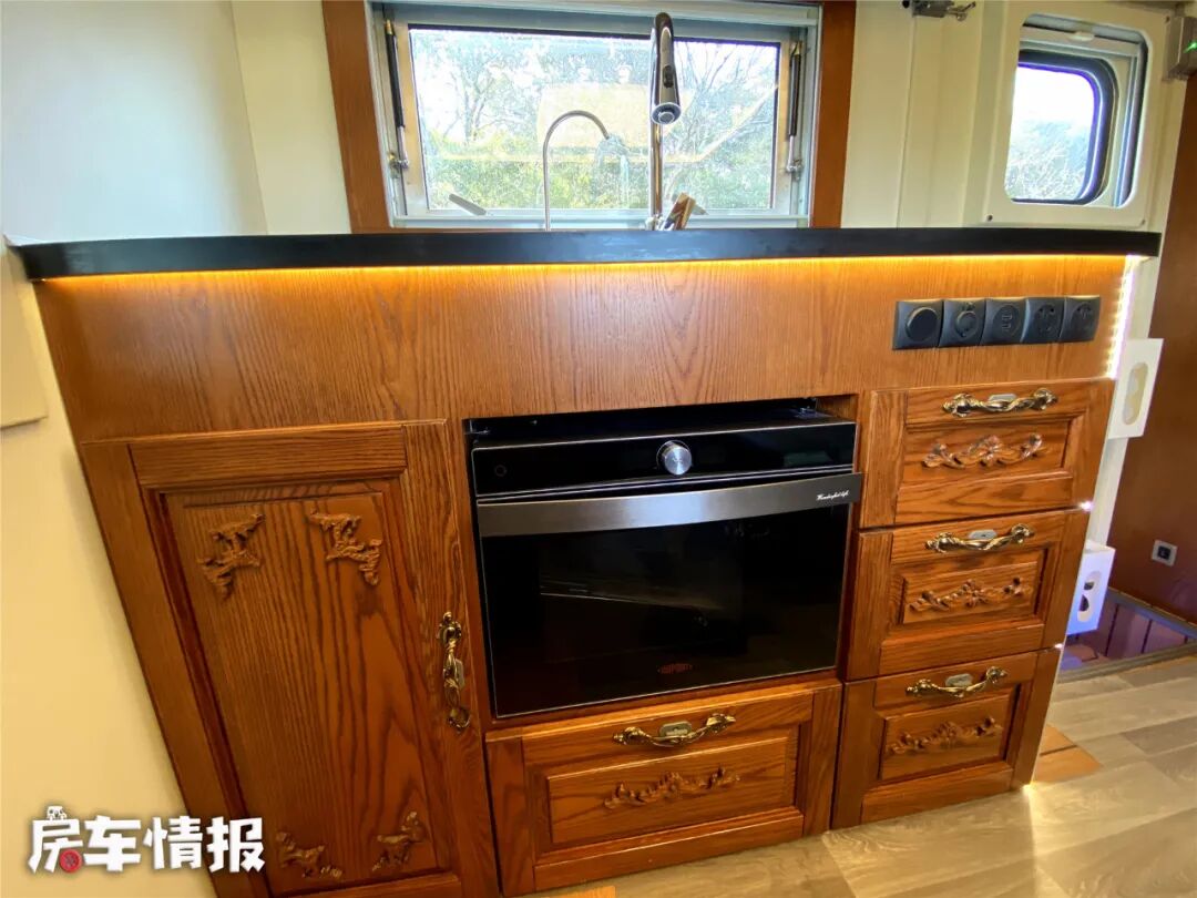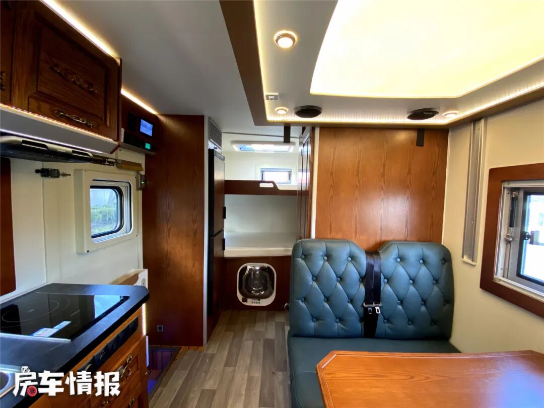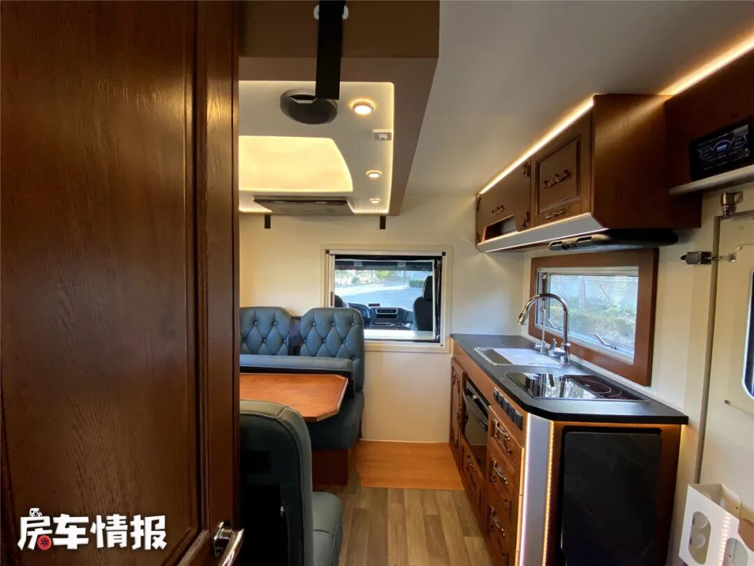 进入车厢内部,受限于车身尺寸,空间并不是很大,基本上和一些依维柯无拓展C型房车相当,但站在车内看向车外,有种高高在上的感觉,还是挺让人安心的,再加上车内所使用的红橡木家具,显得比较古朴富贵。