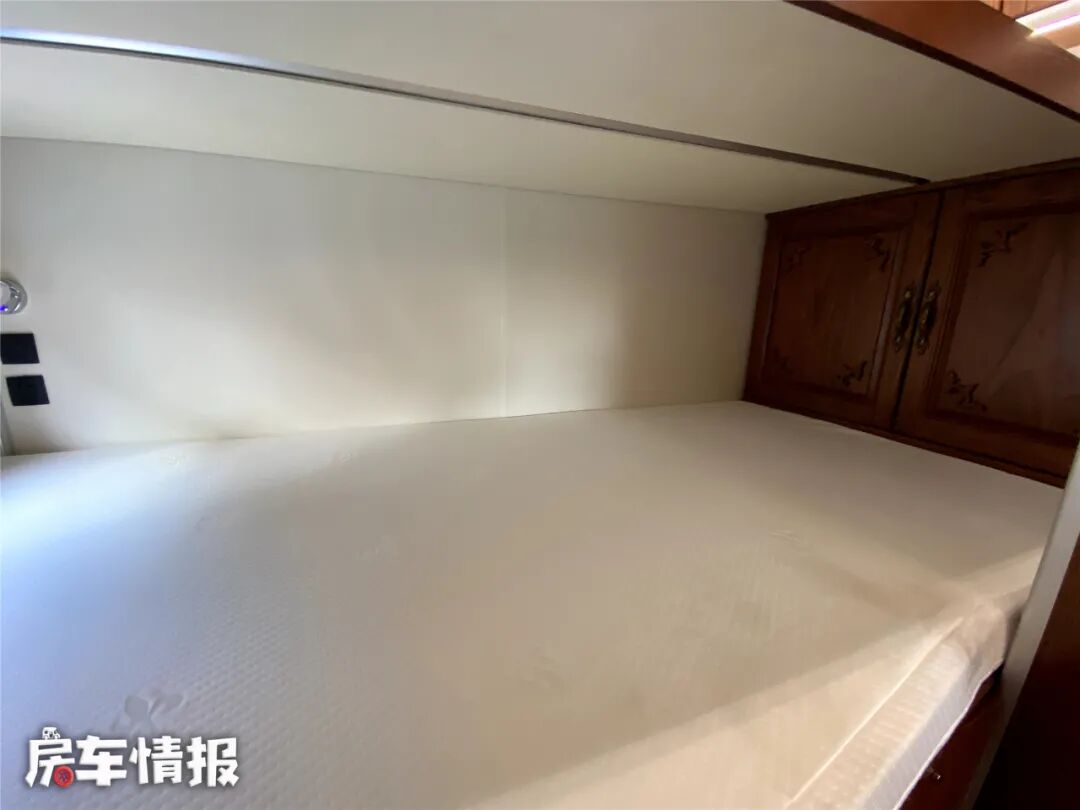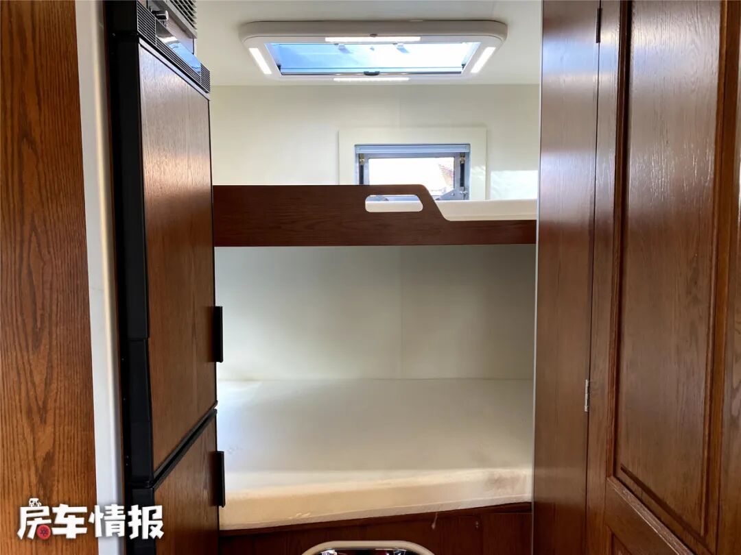 车尾是一组横置上下双层子母床,上层单人床尺寸约为2300*850mm,下层双人床尺寸约为2000*1100mm,位于下层床内侧还提供了一组储物柜,这样的设计有点北方土炕上的炕柜的意思。