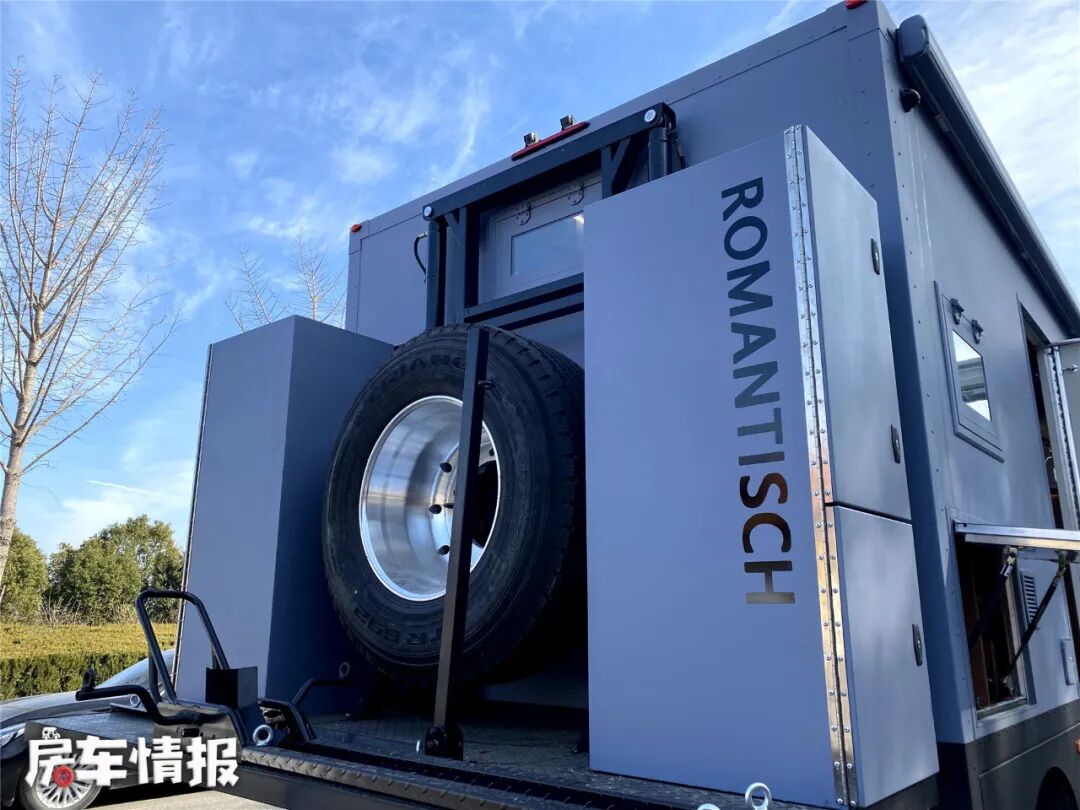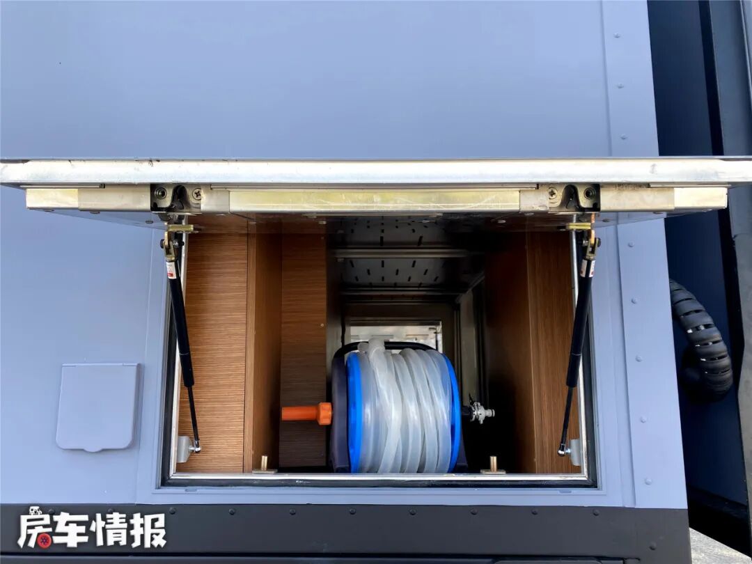 车身侧面的舱体上设有多个开口,里边包含了一个外置花洒、贯通式储物箱、外接电源插口等,而位于车厢中门旁的小盒子里,还提供了一个电子密码锁,让整个开门的动作显得比较贵气。