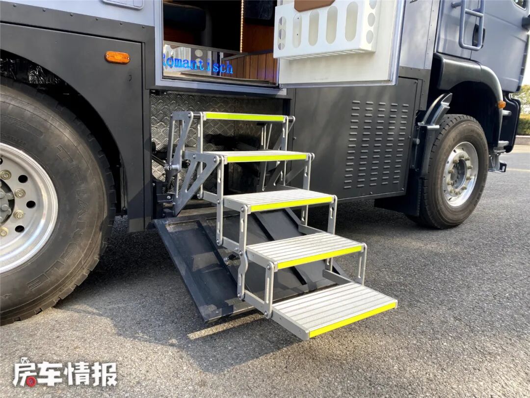 外观看完准备进入车内,由于车内地板离地间隙比较高,需要通过5级电动踏步才能进入车内,输入密码、打开电动踏步然后从容地走进车内。