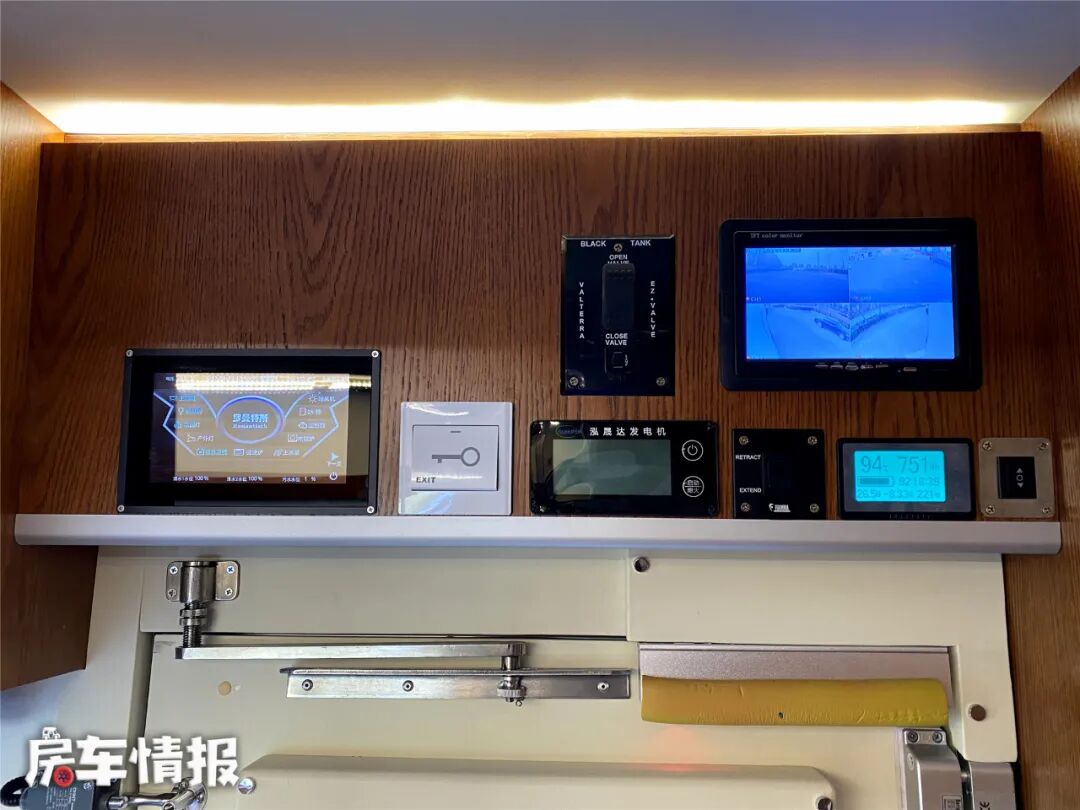 车内的水电控制开关全部结成在中门上方,所有功能都比较直观,日常上手操作无难度,比较有意思的是车厢中门采用电子锁,开关和小区门禁的一样,这点挺让人意外的。