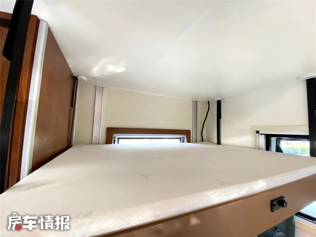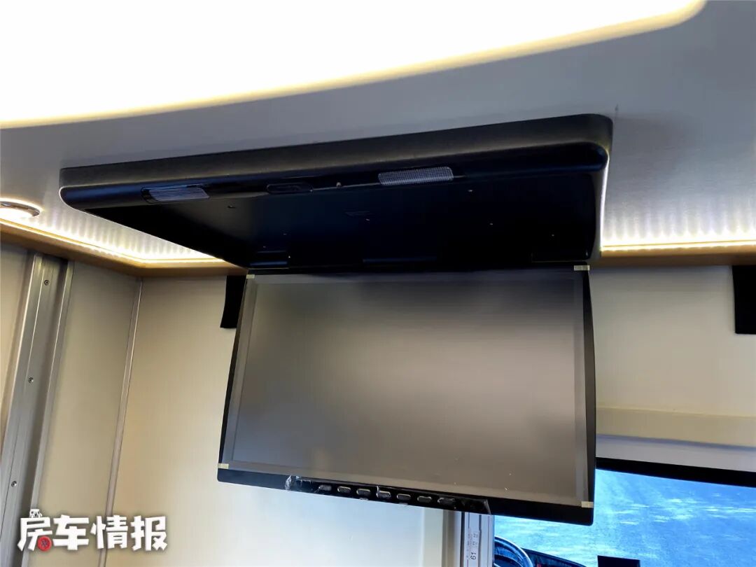 位于升降床板的底部还提供了一台吸顶折叠电视,尺寸不是很大,个人感觉和整车的气质也不是很搭调,后期建议升级成投影仪就更完美了。