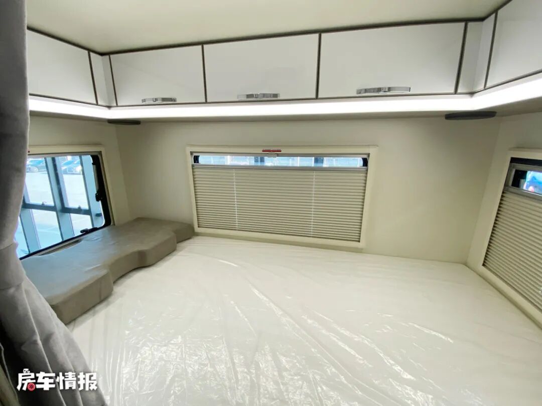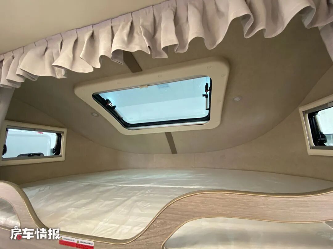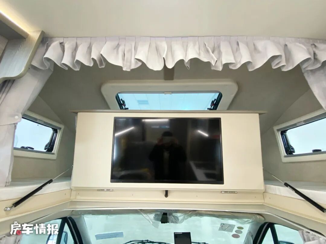 在最前方的驾驶室顶部的额头区域内,标配了一张双人额头床,尺寸为2200*1400mm,可以容纳两个成年人睡觉休息使用,而且采用了三面环窗的设计,看起来极为通透,在床板下方还配有一台32寸的液晶电视,可以提供丰富的娱乐项目。