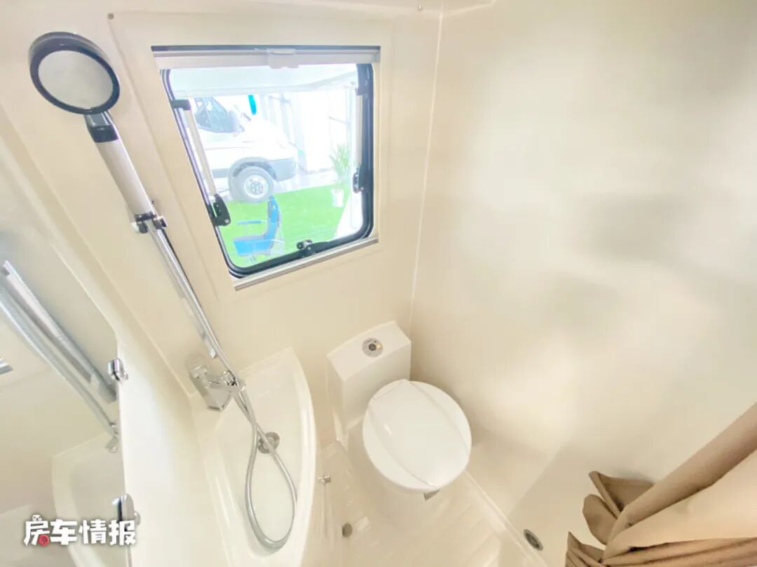 操作台后方是全车的独立卫浴室,内部提供了马桶、洗手台盆、独立的淋浴花洒和梳妆镜,可以解决平时的洗漱问题。