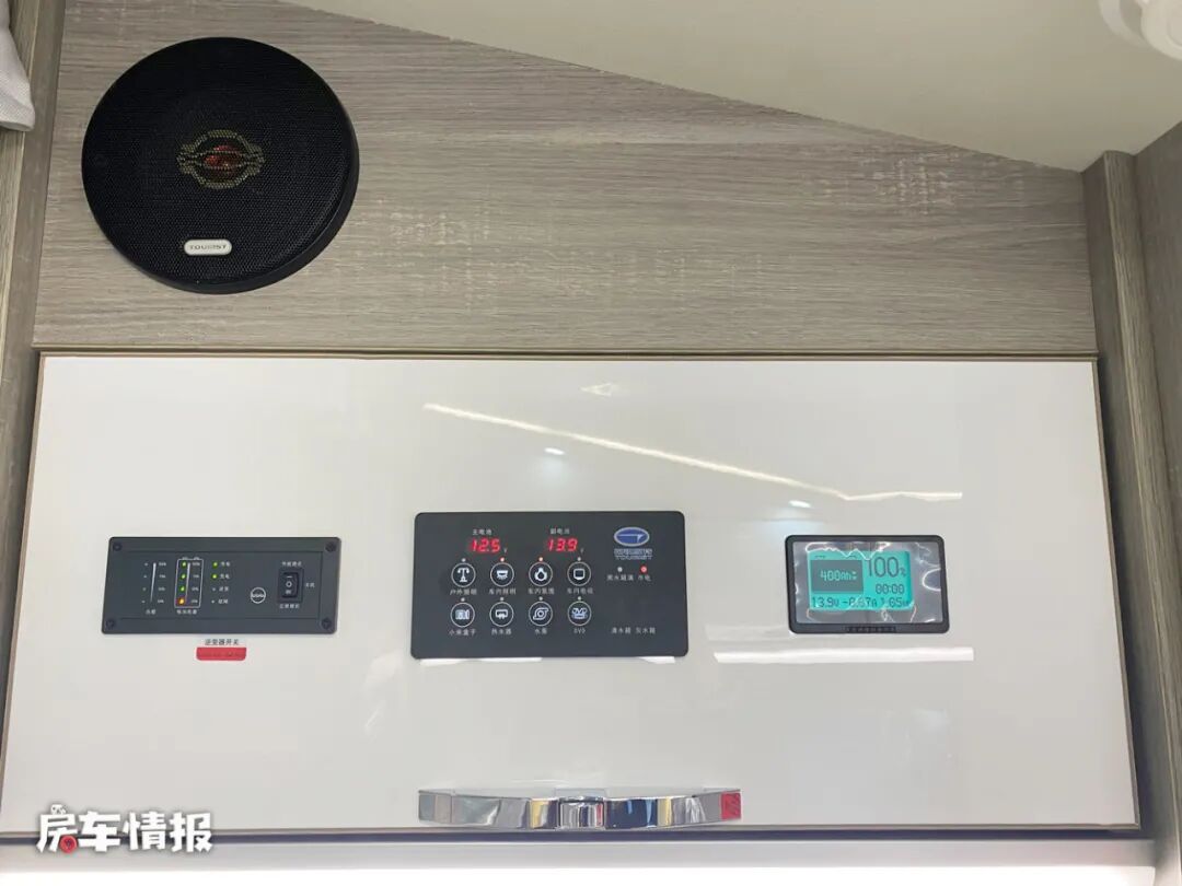 电路上,这款房车搭载的是一台3000W的逆变器,提供400Ah的锂电池,同时在顶部还配备了2块如果新能源的太阳能电池板,采用单晶硅足功率的太阳板可以为房车电力提供更多的保障,如果后期有更多的用电需求,也可以选装800Ah的锂电池,以及3块或4块太阳能电池板;水路上全车拥有230L的净水箱和70L的灰水箱,可以满足日常的用水用电需求。