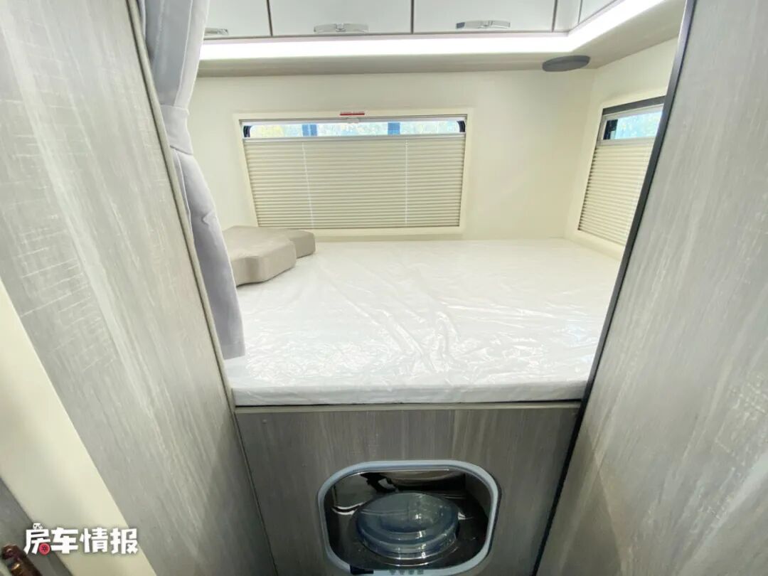 最后是位于车厢尾部的休息区,横置双人床的尺寸达到了2200*1200mm,可以满足两个成年人的睡眠需求,另外整个休息区也采用了三面环窗的设计,整体的采光度非常好,顶部还提供了一圈储物吊柜,可以满足日常存放衣物的需求。在床板下方还嵌入了一台小型的洗衣机,能够洗一些轻薄的衣物。