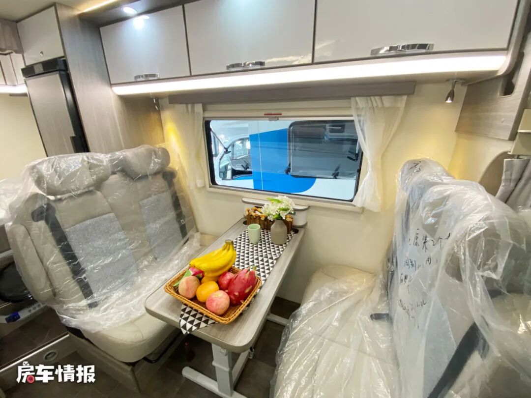 侧面是全车的四人对卡座+移动餐桌的会客区,日常可满足就餐小聚和工作的需求,天气好的时候还可以将餐桌移至到车外进行使用,顶部也提供了基础的吊柜用于存放日常物品。