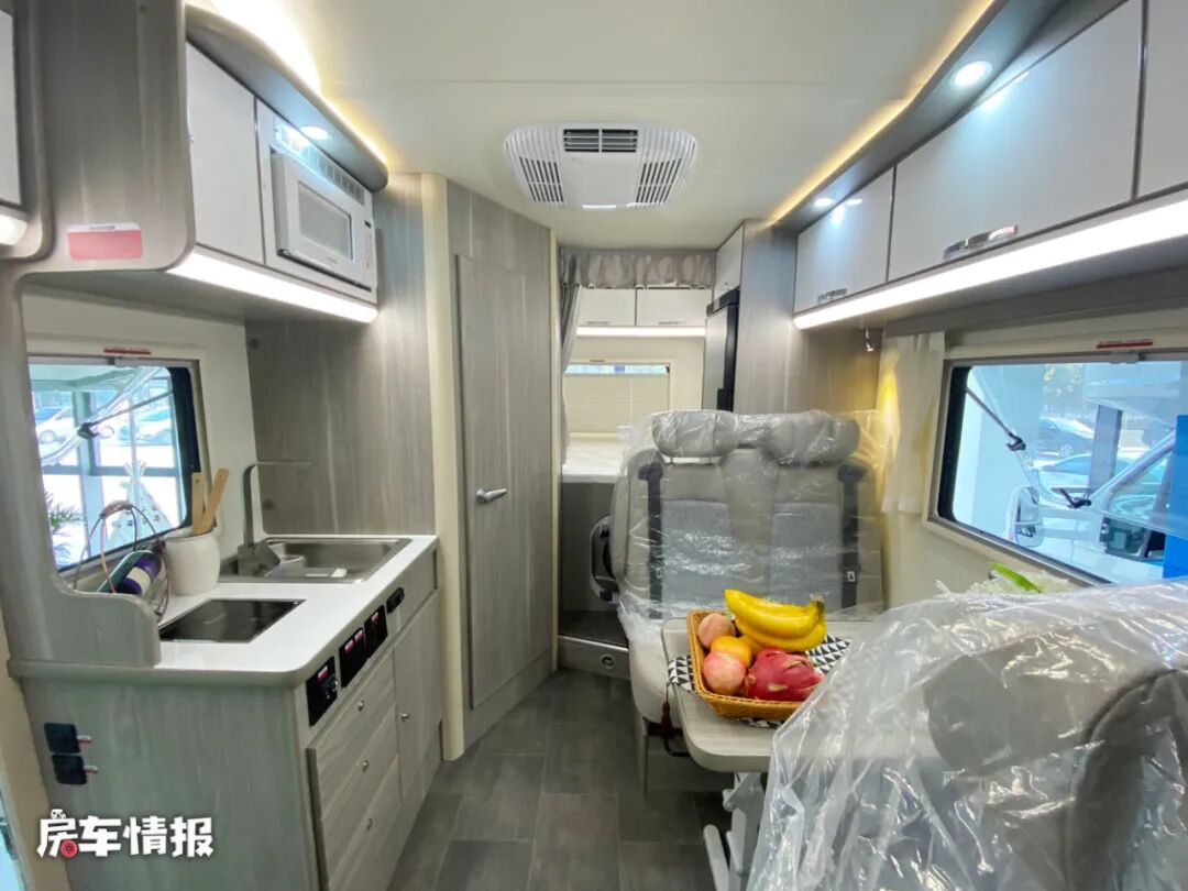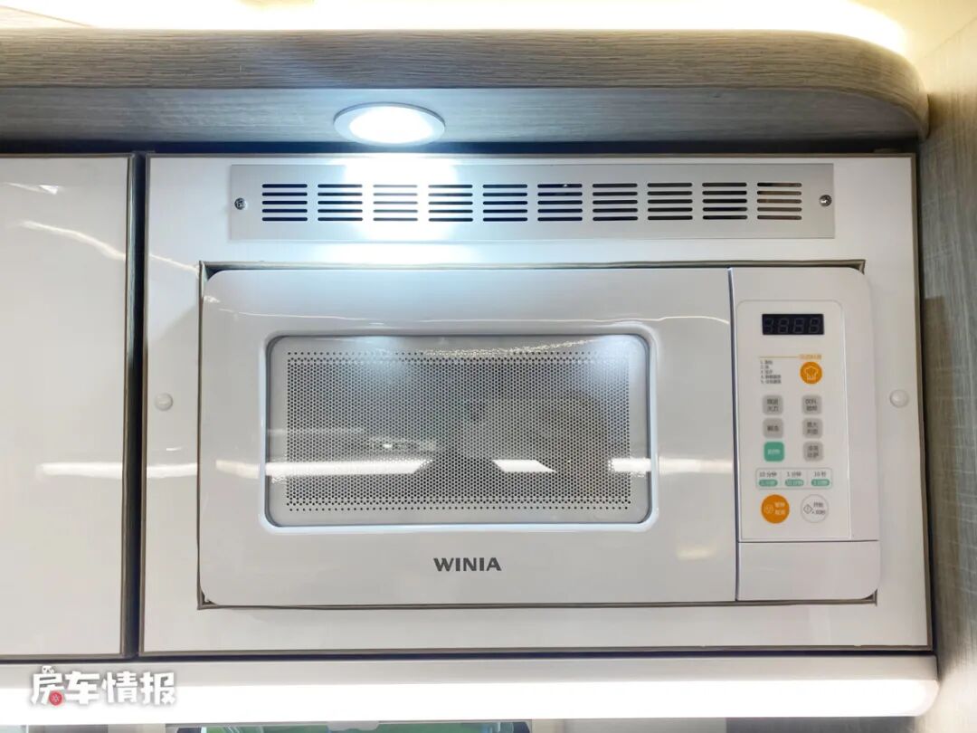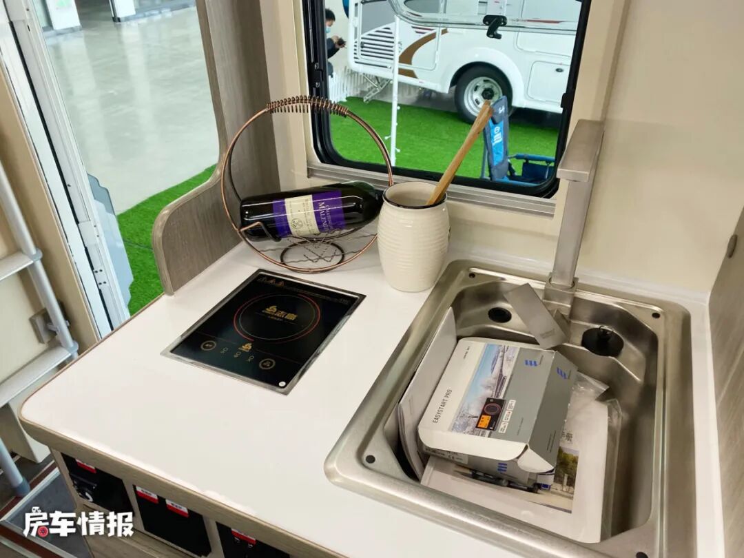 乘客门后方是全车的厨房区域,台面上提供了基础的电磁炉和不锈钢水槽,上方还嵌入了一台微波炉,可以满足日常的烹饪需求。