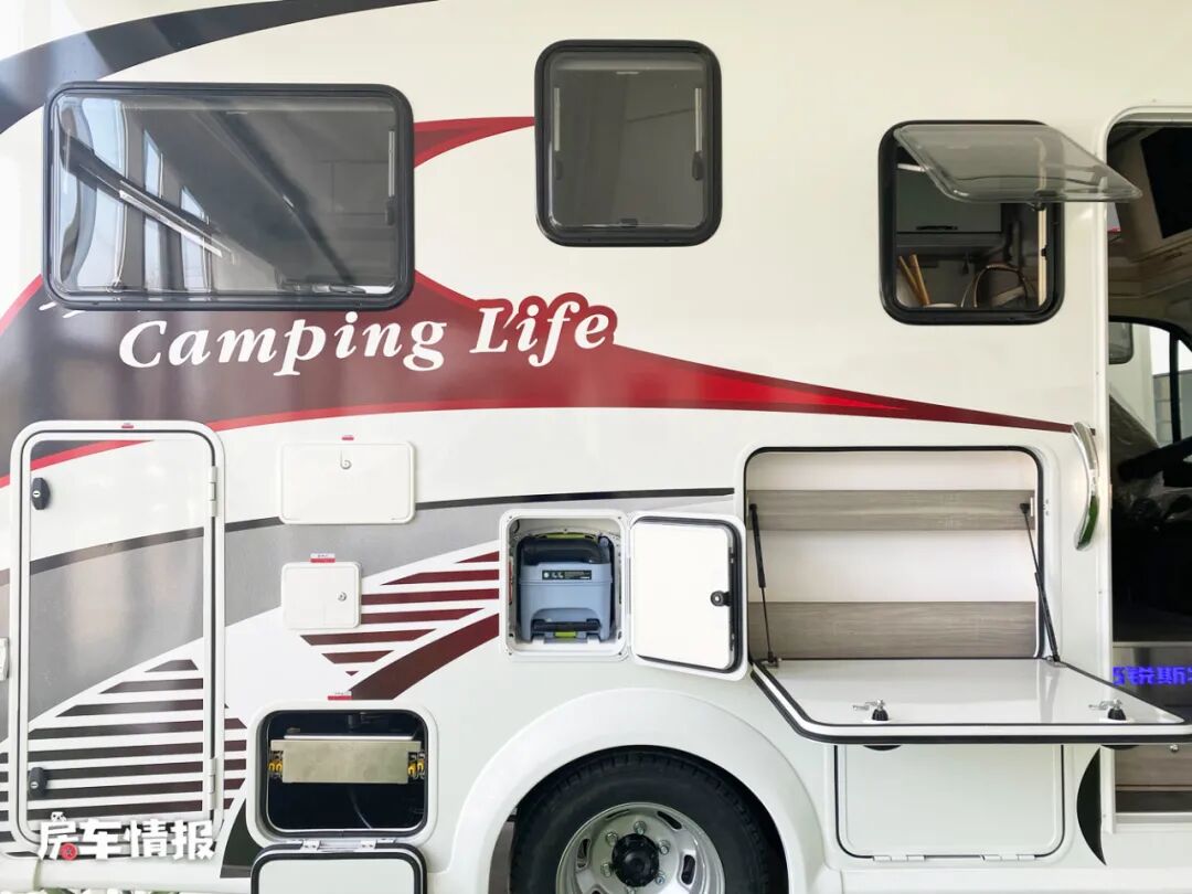 车身外部的整体配色也比较简约时尚,白色的主色调搭配红黑色的拉花,看起来有些运动的氛围感,在车身右侧提供了手动遮阳棚、外置翻板、置物架、抽拉灶台和外置淋浴花洒,可以打造一个室外的厨房区域,同时在后方还提供了左右贯通式的储物舱,可以存放日常所携带的大件行李。