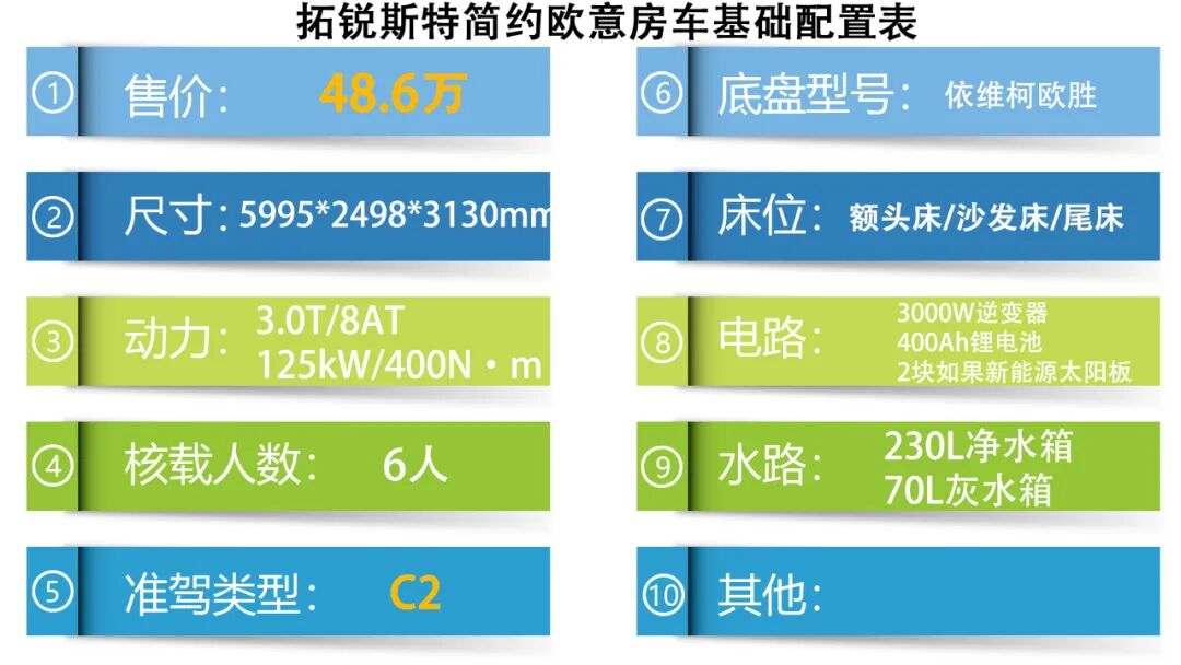这款搭载2021款依维柯欧胜底盘所打造的拓锐斯特简约欧意房车,虽然是一辆无拓展的车型,但是内部却运用了双拓展车内的布局,而且因为较宽的厢体所以使内部的空间表现也不错,现在这款房车的官方指导价为48.6万元,不知道您对于这样设计的一款房车有什么看法吗?欢迎在下方的评论区和我们互动交流,下期再见~