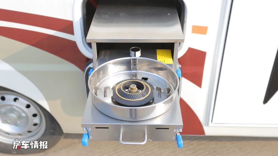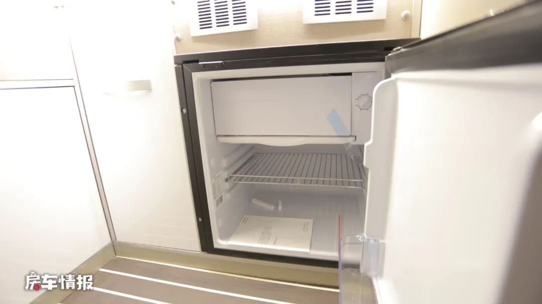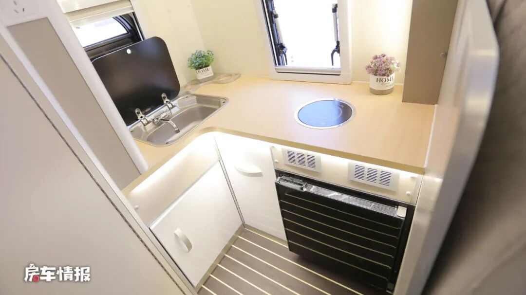 而全车的厨房区是位于车厢最尾处,采用L型吧台式的设计,整体的面积还是比较可观的,台面上配置了基础的电磁炉以及翻盖的大尺寸水槽,可以满足日常的基础烹饪需求。下方则嵌入了一台50L的车载冰箱,顶部还提供了多个储物吊柜,可以满足平时储物的需求。
