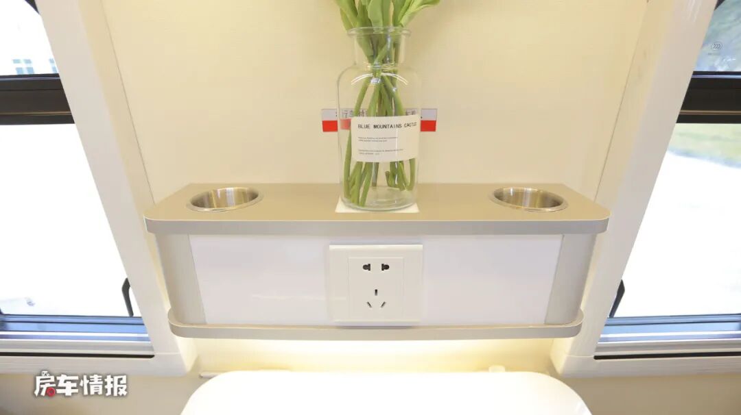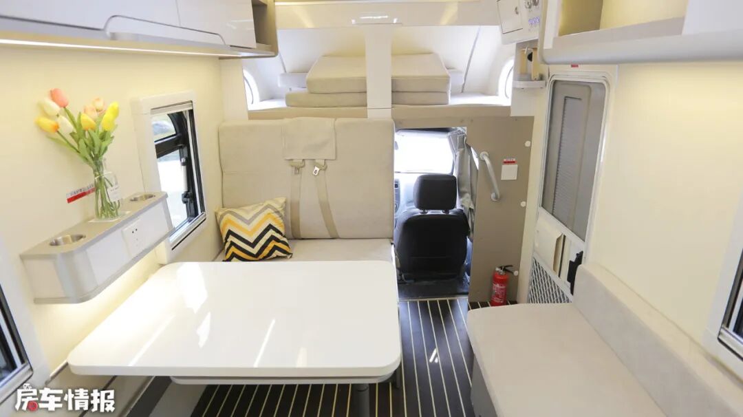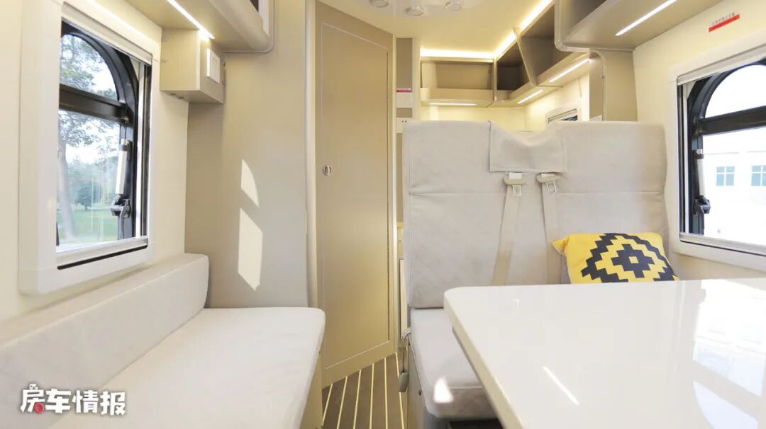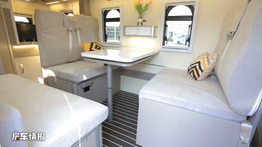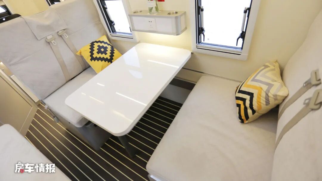 车内的会客区采用了四人对卡座沙发+餐桌的设计,并配置了四条安全带,整车最多可以核载6个人,会客区侧面的观赏窗设计也和我们以往见到的不同,为一左一右两扇外推窗,中间则是一个小型的置物平台,带有220V的电源插口,后期也可以在这里办公,又或者插上电磁炉在寒冷的冬日享受火锅大餐。