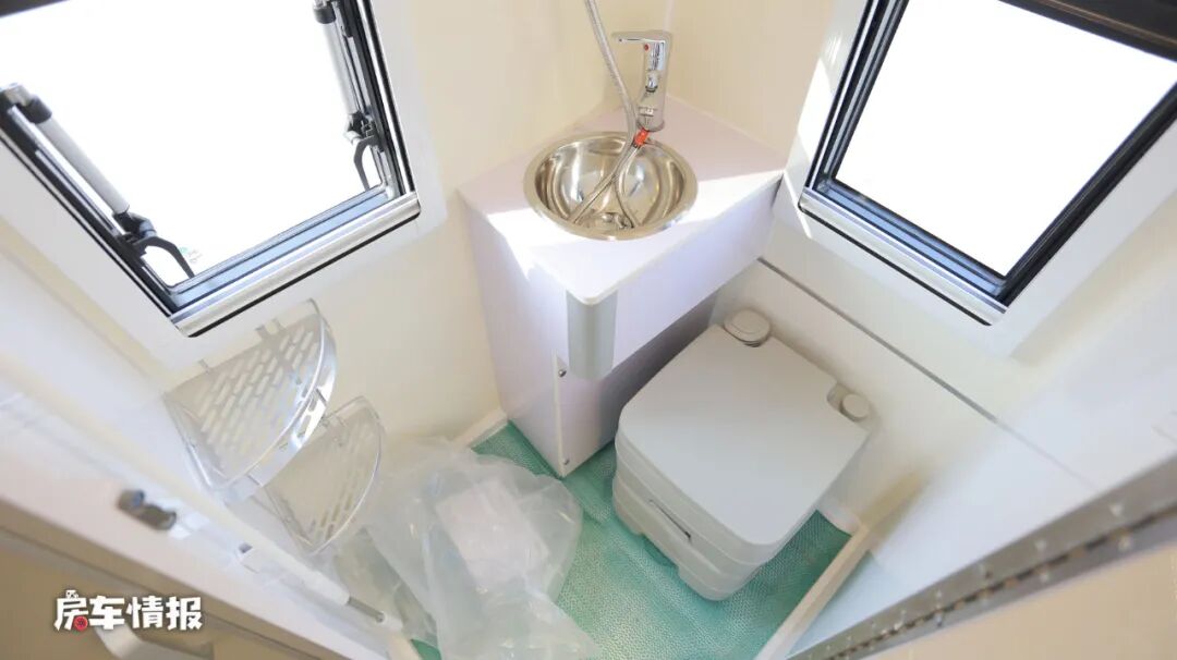 另外一侧则是全车的独立卫浴室,内部带有便携式的马桶、独立的淋浴花洒、洗手台盆和置物架,日常的基础洗漱也可以满足。