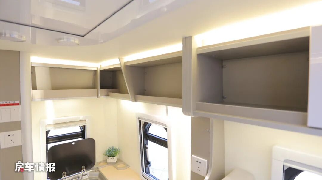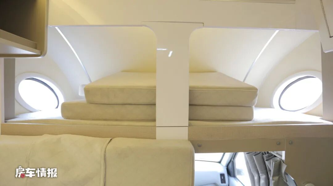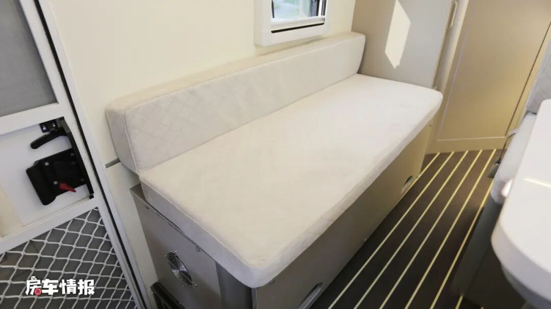 最前方驾驶室上方的额头区域虽然不大,尺寸仅为1600*900mm,但是也可以睡个小朋友,或者日常存放一些被褥作为储物空间使用。