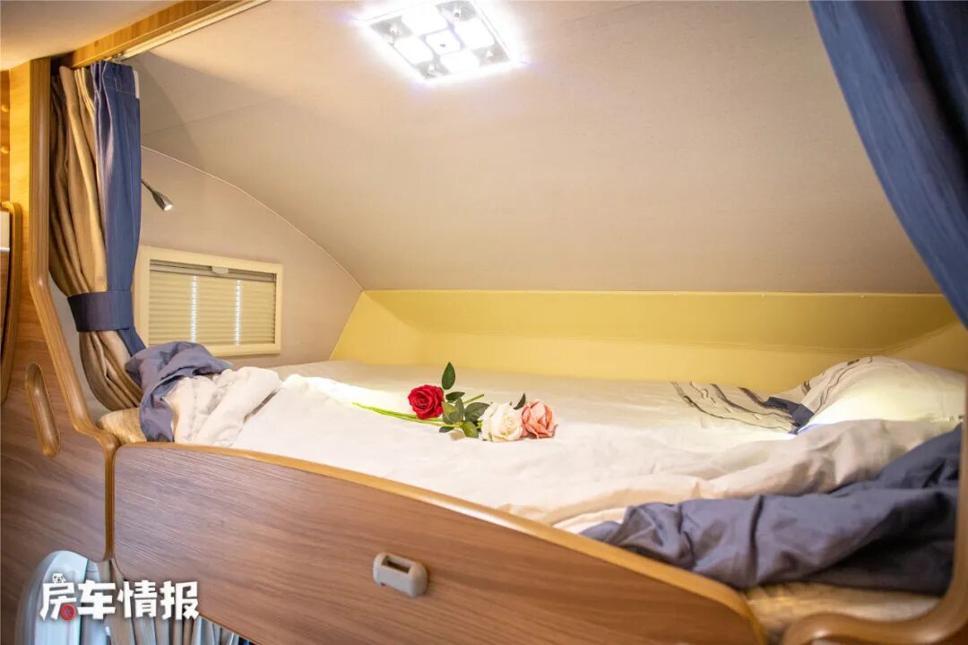 车内另一个床铺位于驾驶室上方的额头床,尺寸非常之大,长宽达到了2300*1400mm,再加上车顶较高的隆起,额头床内侧的垂直高度也很不错,日常使用并不会感到压抑。