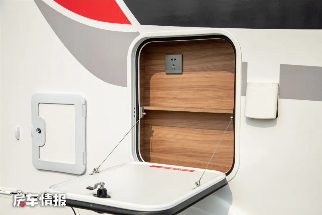 车身外部提供了比较丰富的外部设备,手动遮阳棚、外置物翻板、外接出水口、外挂式备胎、电动踏步、登车扶手等,提高了日常使用的便利性。