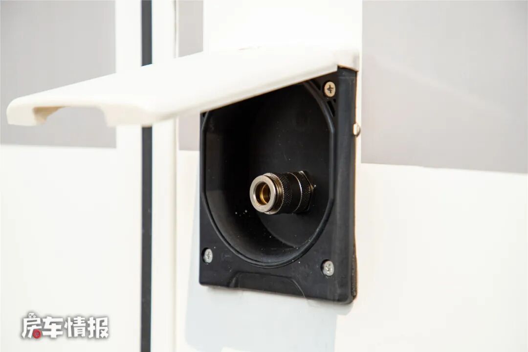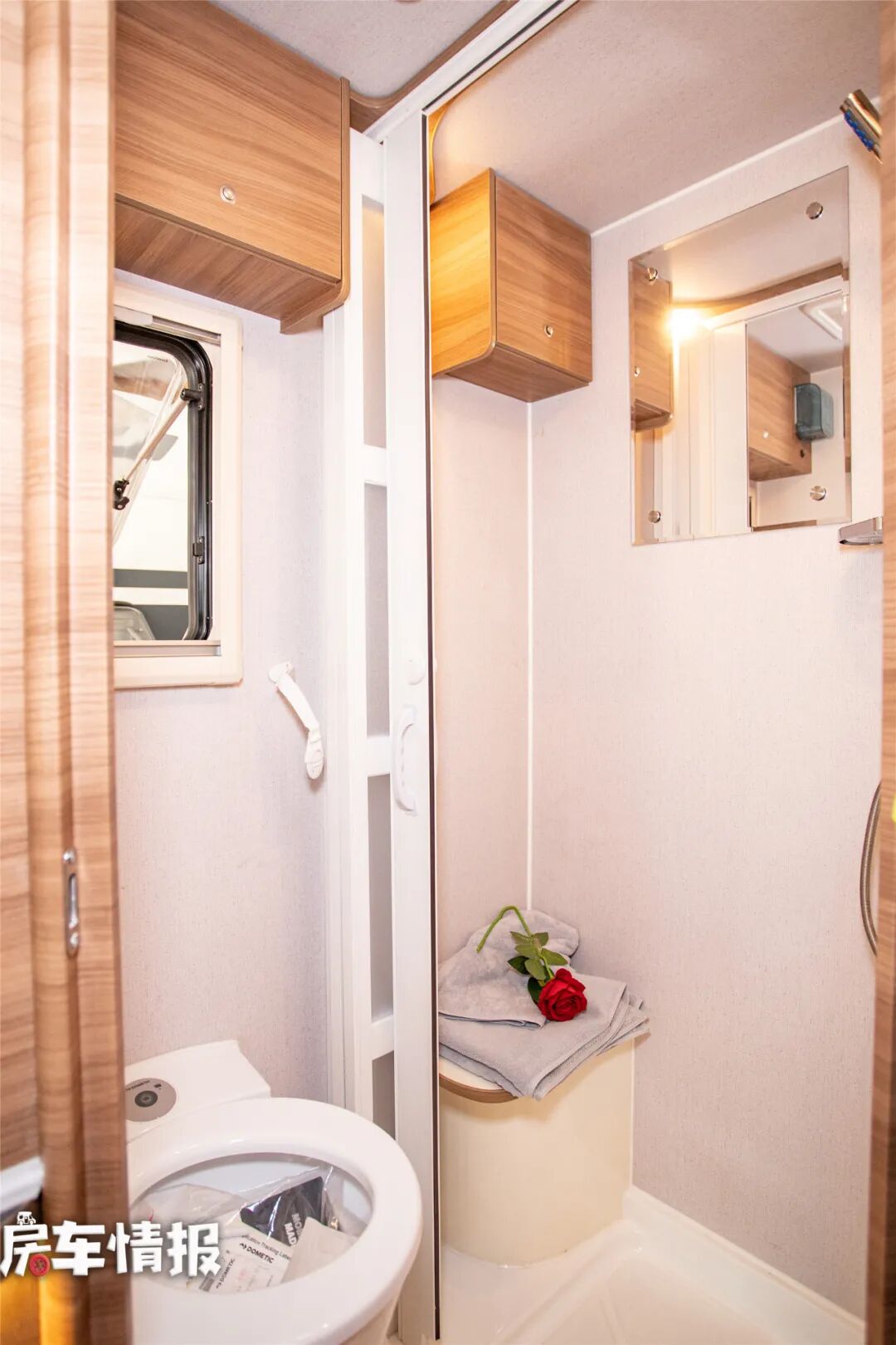 位于卫生间后方是车内的卫生间,这里是车上的一个亮点所在,在这辆无拓展房车里,竟然设置了一个干湿分离的卫生间,这在同类型房车里是十分少见的,卫生间内部空间挺不错,内侧为独立的淋浴间,外侧为马桶洗手池所在区域,当遇到紧急情况时,即便内侧淋浴间有人在洗澡,外部的坐便依然可使用,只不过味道会有些让人难受。