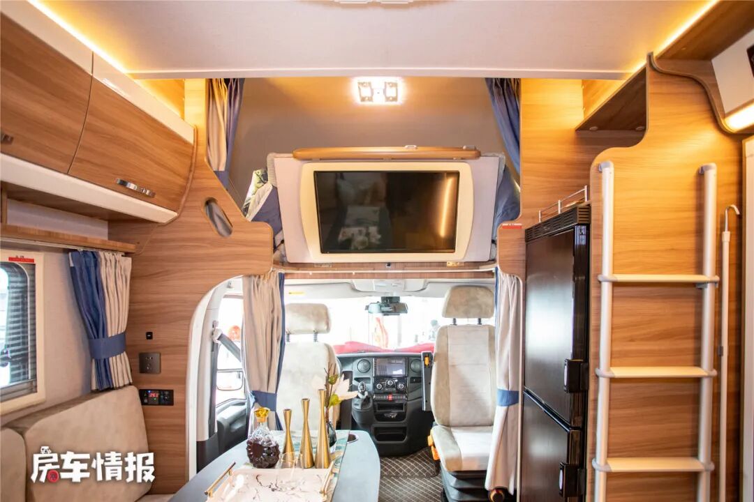 把额头床掀起,下方是一台隐藏的液晶电视,便于在旅行时观看电视节目。