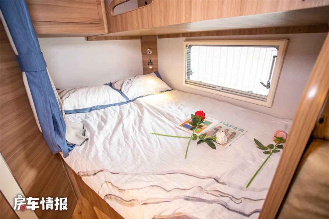 接下来看一看车内的床位休息区域,首先是车尾部的上下床层子母床,上层为单人床,尺寸约为1850*800mm,可以满足单人使用;下层为双人床,尺寸约为1850*1400mm,睡下2名成年人没有问题。