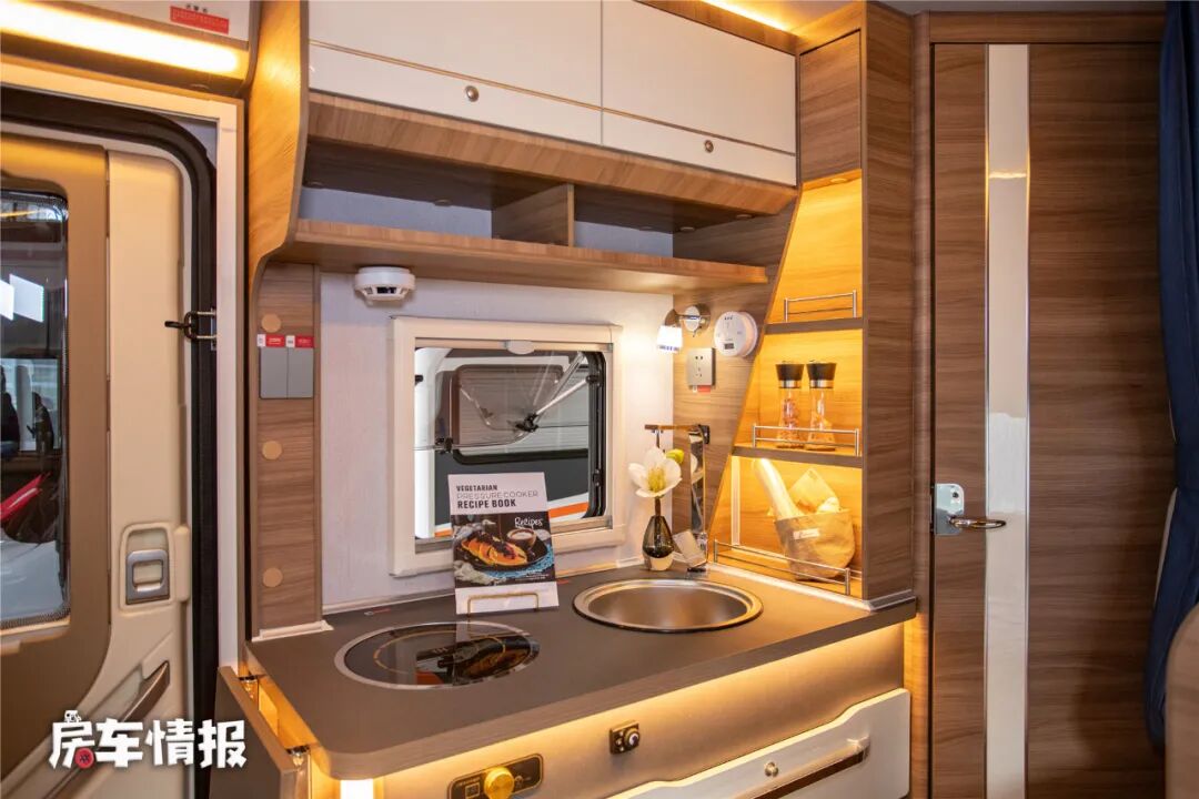 车厢中门后方是车内厨房所在的位置,车内厨房提供了电磁炉、洗菜池、冰箱等常规设备,位于厨房操作台内侧设有三级开放式储物格,在驻车以后可以存放调料瓶,行车时要急着收起来或者将其固定。