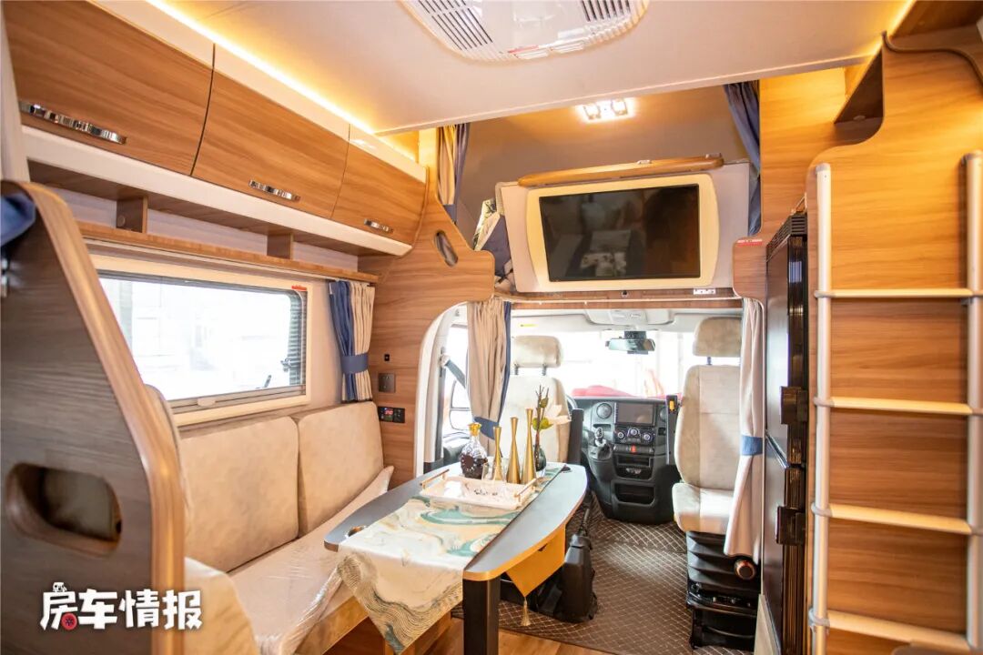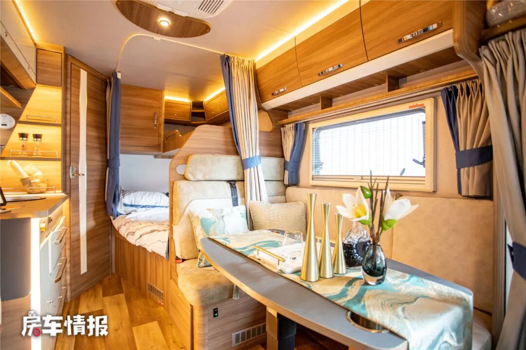 来到生活区,首先可以感受到的是2.3米内宽带来的开阔感,比起其它品牌的无拓展车型,横向空间感受更好,生活区家具配色和做工一如既往地保持了该系列车型的高水准,原木纹的家具饰板看起来也比较的简约、居家。