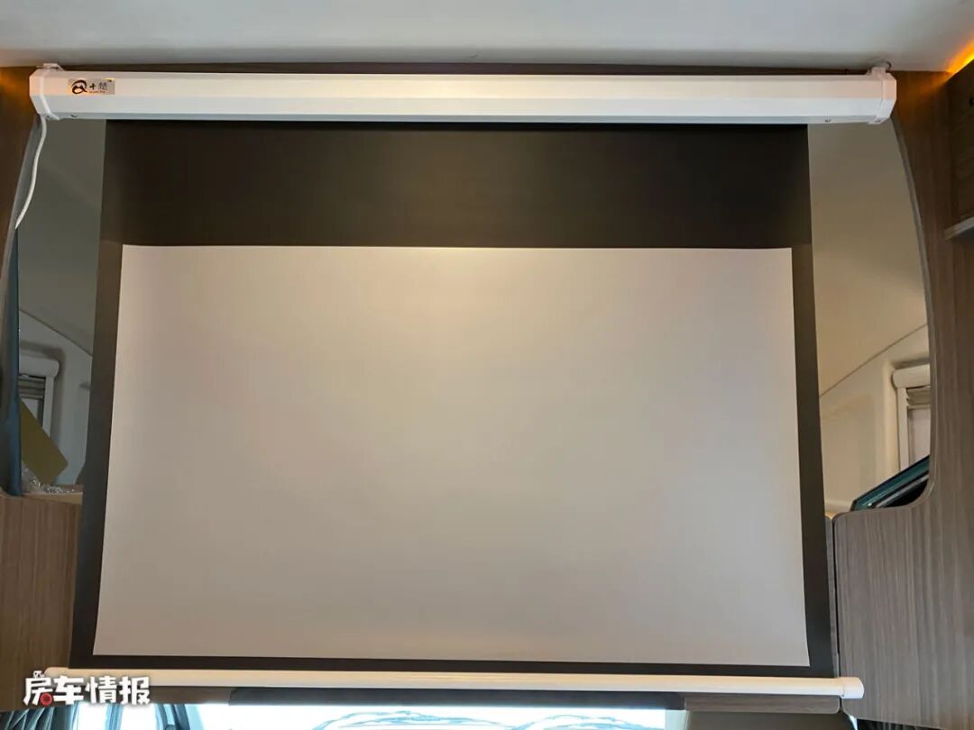 在额头区顶部还配备了一个幕布,结合车厢尾部的投影仪,也可以打造一个比较私密的影音视听空间,可以更加享受房车生活。