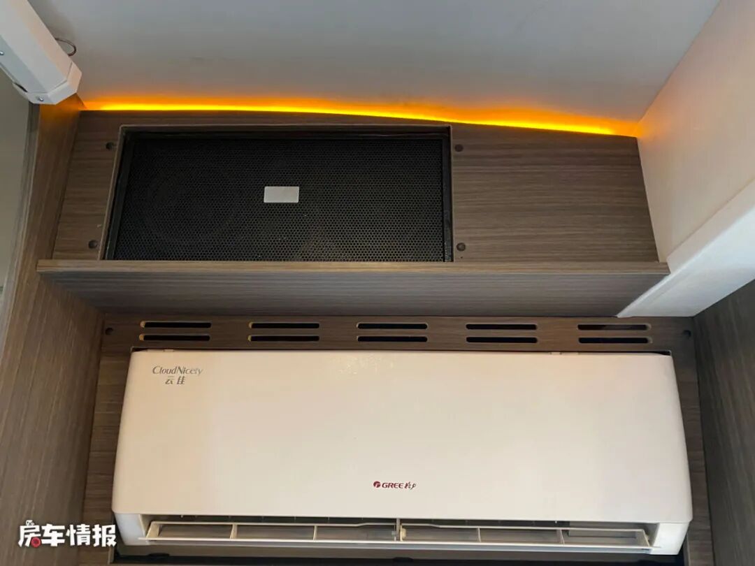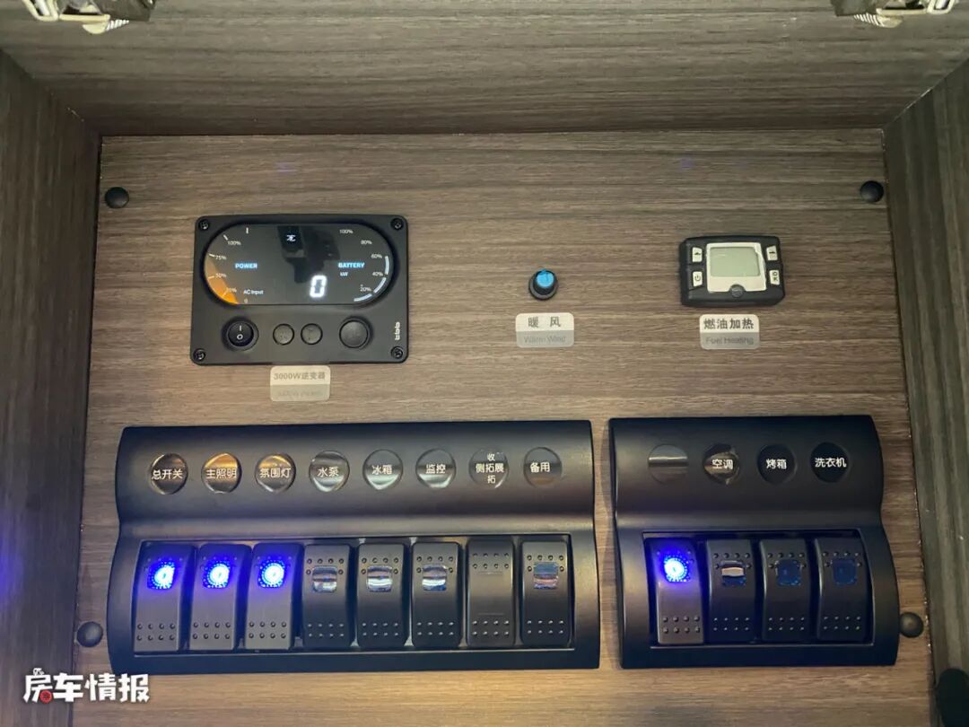 电路上,这款房车是搭载了一台3000W的逆变器,提供两组共1000Ah的锂电池,相当于出厂自带10度电;水路上则提供了280L的净水箱和60L的灰水箱,同时整车还提供了9000W的暖风热水系统和一台家用变频空调,即便在寒冷的冬天也可以洗澡和住宿。
