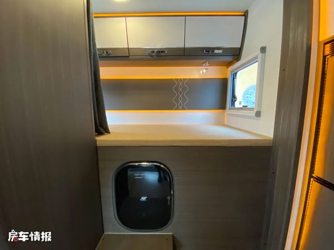 最后是位于车厢尾部的休息区,采用了横置床的设计,尺寸为2200*850mm,顶部还提供了基础的吊柜,可以用来存放一些换洗的衣物,两边都带有外推窗,整体的采光度也不错。床板下方还配置了一台小型的洗衣机,可以满足生活中的更多需求。