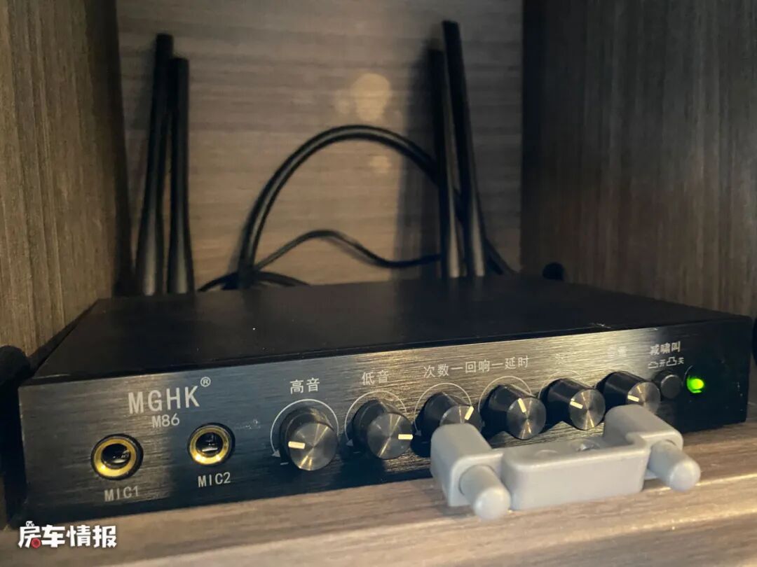 刚才我们也说过这是一辆能在车内唱KTV的房车,那么是在什么地方体现的呢,除了大尺寸的投影幕布之外,这个功放机就隐藏在厨房操作台上方的吊柜内,还提供了麦克风,可以满足爱唱歌的朋友们释放自己的歌喉。