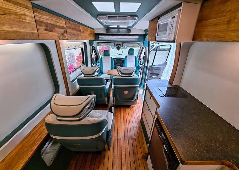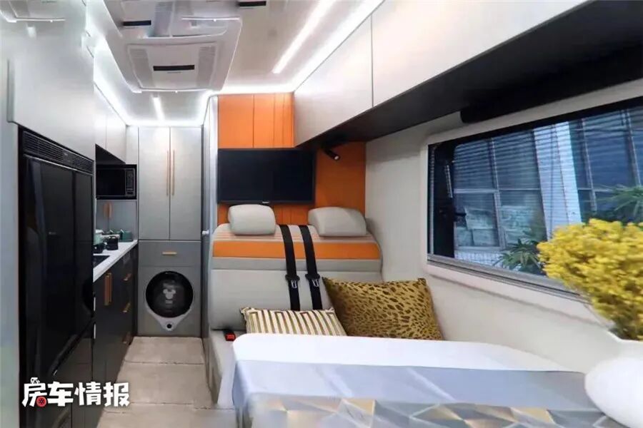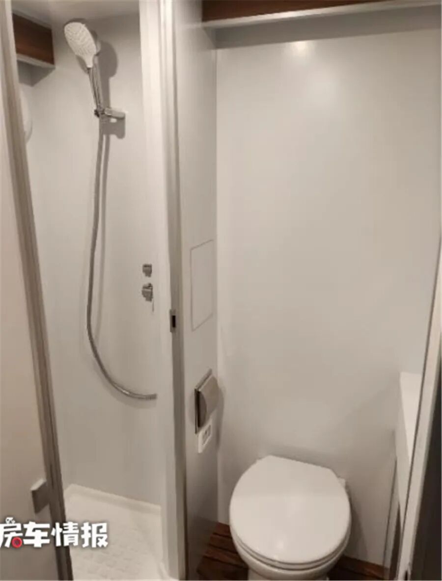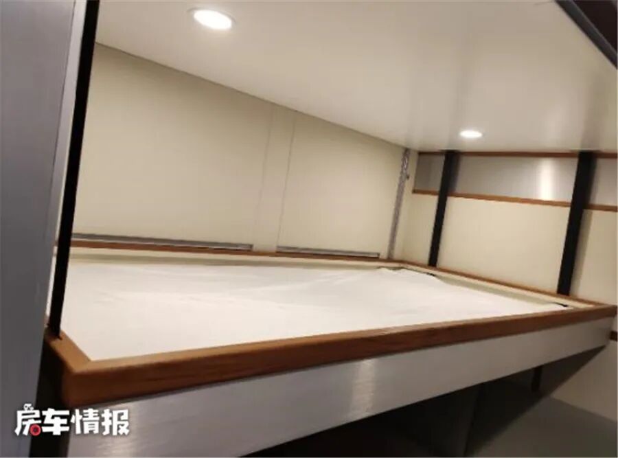 车辆内部的设计也挺有意思,除去主副驾驶座椅,生活区内提供了4张独立航空座椅,可以看出来是为了保证长途行驶时的舒适性,车厢尾部提供了固定卫生间和厨房设备,夜晚休息的话,在车厢顶部提供了一张尺寸约为1800*1200mm的小尺寸双人床,睡俩人会比较挤。