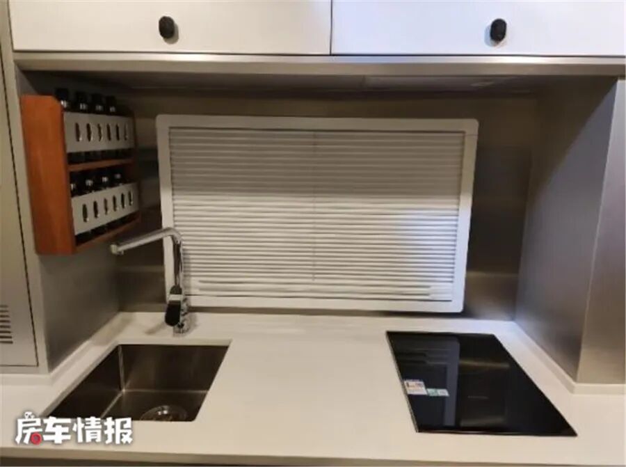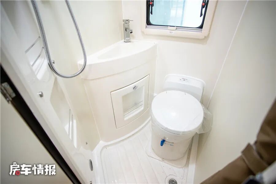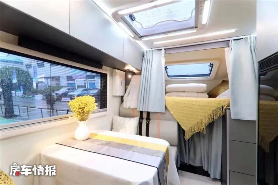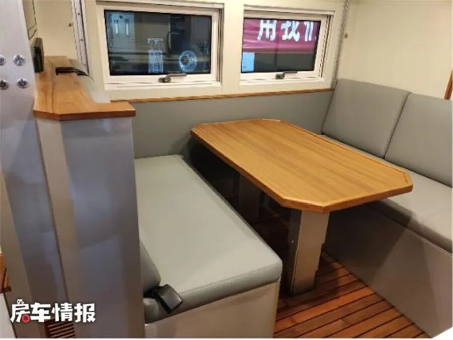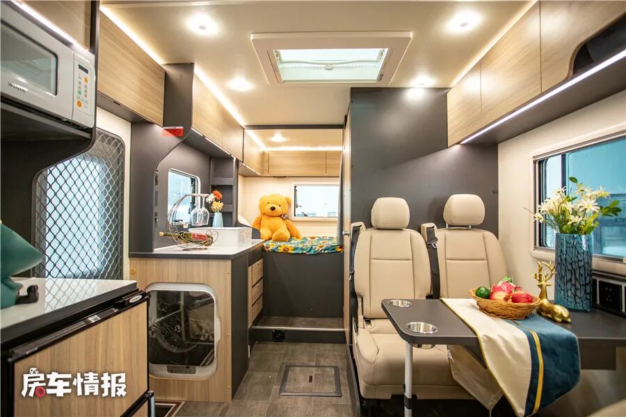 车内的整体布局相对较为常规,提供了一张固定额头床、最卡座休息区可变沙发床、独立厨房区域以及独立卫生间,基本上能够满足一家2-3人使用。