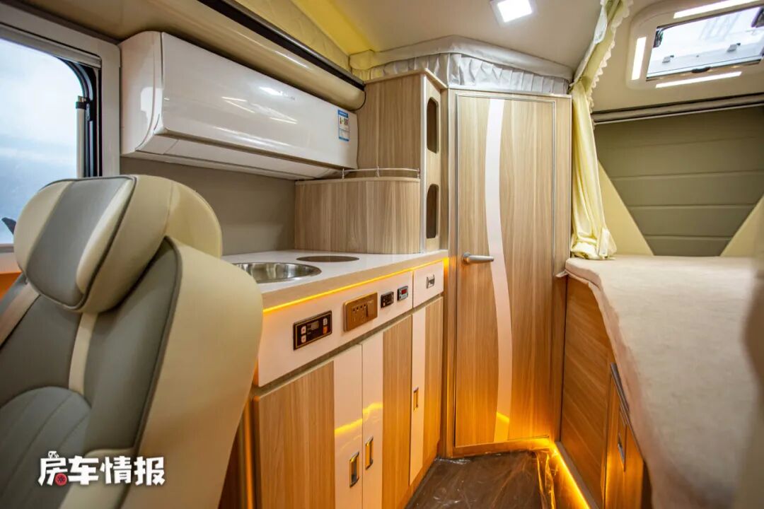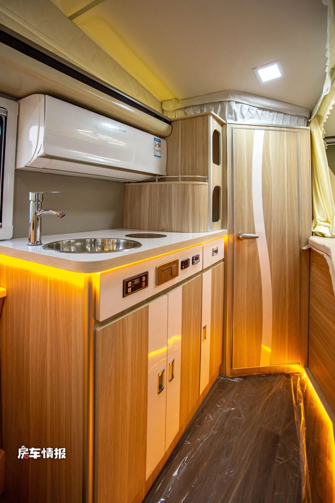 电动沙发椅的后面是这款房车的厨房区,台面不算很大,左边是一个洗菜池,右边提供了一个电磁炉,下面是储物柜。最奇特的是在厨台上面非常近的地方安装了一台家用空调,以此为车内提供冷暖气。