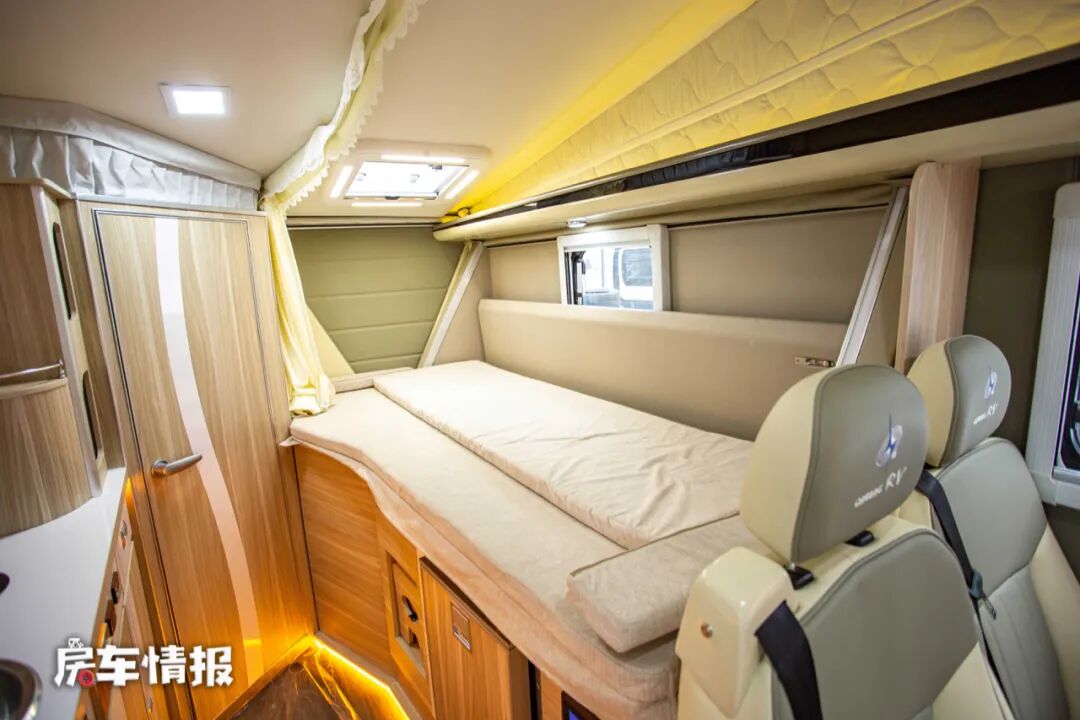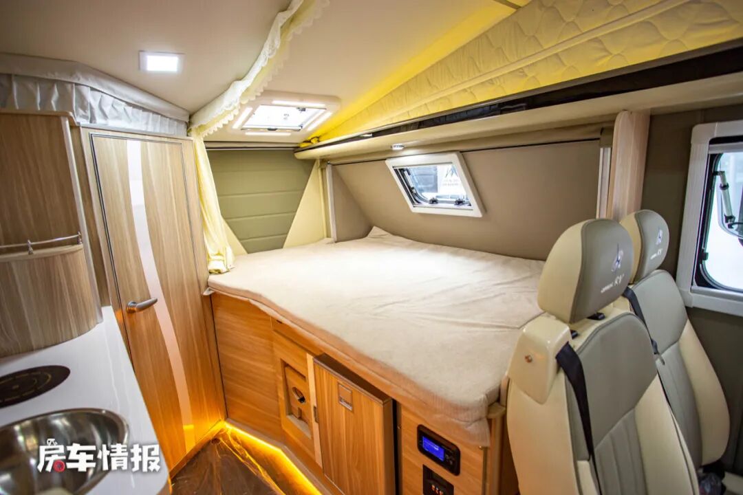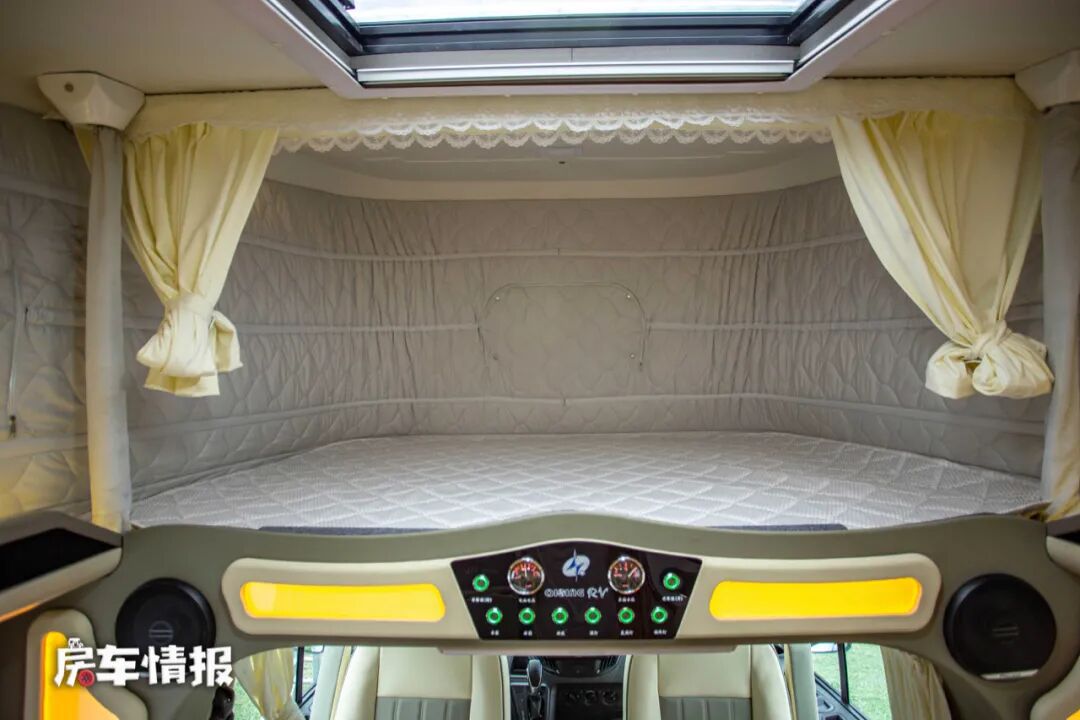 另外除去休息区的床铺,在顶部的升顶打开后,还隐藏了一张2000*1400(mm)的额头床,足够两个成年人平时使用。
